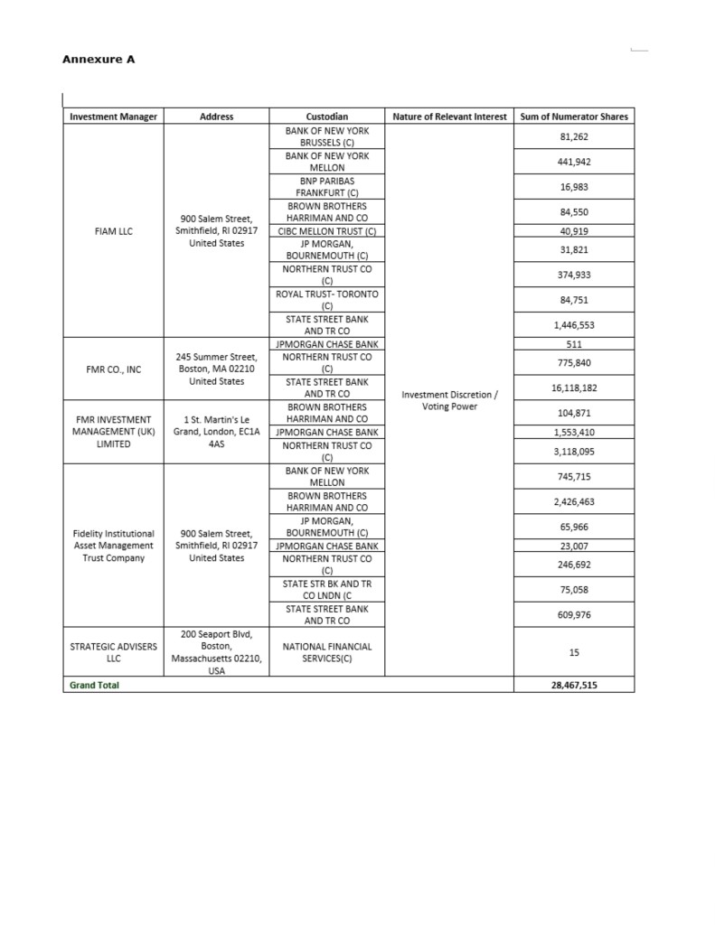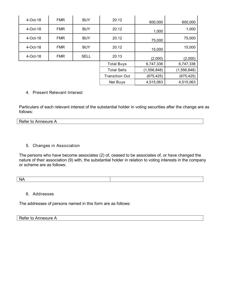 4-Oct-18 FMR BUY 20.12 600,000 600,000 4-Oct-18 FMR BUY 20.12 1,000 1,000 4-Oct-18 FMR BUY 20.12 75,000 75,000 4-Oct-18 FMR BUY 20.12 15,000 15,000 4-Oct-18 FMR SELL 20.13 (2,000) (2,000) Total Buys 6,747,336 6,747,336 Total Sells (1,556,848) (1,556,848) Transition Out (675,425) (675,425) Net Buys 4,515,063 4,515,063 4. Present Relevant Interest Particulars of each relevant interest of the substantial holder in voting securities after the change are as follows: Refer to Annexure A 5. Changes in Association The persons who have become associates (2) of, ceased to be associates of, or have changed the nature of their association (9) with, the substantial holder in relation to voting interests in the company or scheme are as follows: NA 6. Addresses The addresses of persons named in this form are as follows: Refer to Annexure A