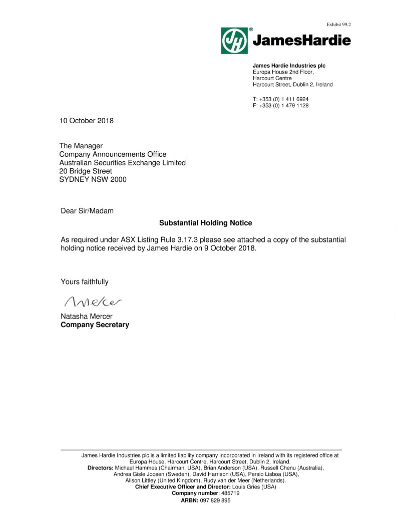 Exhibit 99.2 James Hardie Industries plc Europa House 2nd Floor, Harcourt Centre Harcourt Street, Dublin 2, Ireland T: +353 (0) 1 411 6924 F: +353 (0) 1 479 1128 10 October 2018 The Manager Company Announcements Office Australian Securities Exchange Limited 20 Bridge Street SYDNEY NSW 2000 Dear Sir/Madam Substantial Holding Notice As required under ASX Listing Rule 3.17.3 please see attached a copy of the substantial holding notice received by James Hardie on 9 October 2018. Yours faithfully Natasha Mercer Company Secretary James Hardie Industries plc is a limited liability company incorporated in Ireland with its registered office at Europa House, Harcourt Centre, Harcourt Street, Dublin 2, Ireland. Directors: Michael Hammes (Chairman, USA), Brian Anderson (USA), Russell Chenu (Australia), Andrea Gisle Joosen (Sweden), David Harrison (USA), Persio Lisboa (USA), Alison Littley (United Kingdom), Rudy van der Meer (Netherlands). Chief Executive Officer and Director: Louis Gries (USA) Company number: 485719 ARBN: 097 829 895