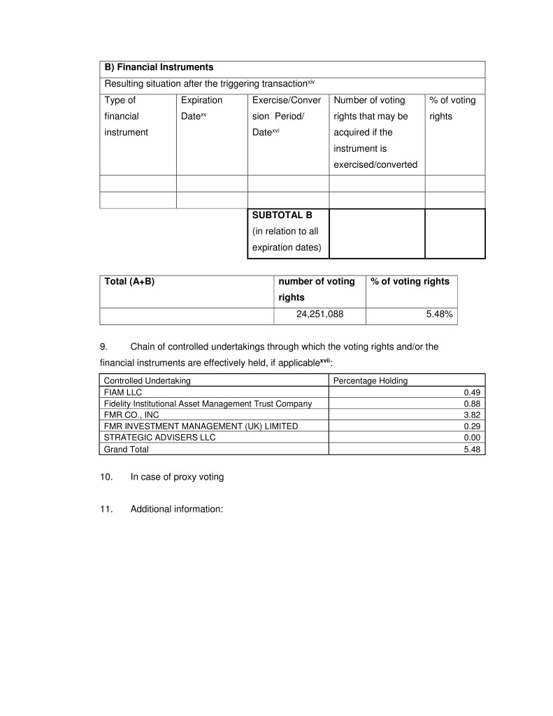 B) Financial Instruments Resulting situation after the triggering transaction xiv Type of Expiration Exercise/Conver Number of voting % of voting financial Date xv sion Period/ rights that may be rights instrument Date xvi acquired if the instrument is exercised/converted SUBTOTAL B (in relation to all expiration dates) Total (A+B) number of voting % of voting rights rights 24,251,088 5.48% 9. Chain of controlled undertakings through which the voting rights and/or the financial instruments are effectively held, if applicable xvii : Controlled Undertaking Percentage Holding FIAM LLC 0.49 Fidelity Institutional Asset Management Trust Company 0.88 FMR CO., INC 3.82 FMR INVESTMENT MANAGEMENT (UK) LIMITED 0.29 STRATEGIC ADVISERS LLC 0.00 Grand Total 5.48 10. In case of proxy voting 11. Additional information: