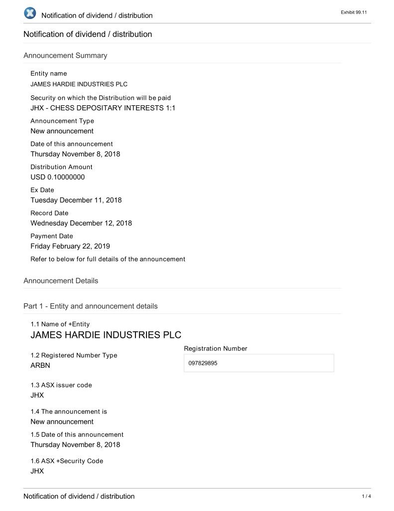 Notification of dividend / distribution Exhibit 99.11 Notification of dividend / distribution Announcement Summary Entity name JAMES HARDIE INDUSTRIES PLC Security on which the Distribution will be paid JHX - CHESS DEPOSITARY INTERESTS 1:1 Announcement Type New announcement Date of this announcement Thursday November 8, 2018 Distribution Amount USD 0.10000000 Ex Date Tuesday December 11, 2018 Record Date Wednesday December 12, 2018 Payment Date Friday February 22, 2019 Refer to below for full details of the announcement Announcement Details Part 1 - Entity and announcement details 1.1 Name of +Entity JAMES HARDIE INDUSTRIES PLC Registration Number 1.2 Registered Number Type ARBN 097829895 1.3 ASX issuer code JHX 1.4 The announcement is New announcement 1.5 Date of this announcement Thursday November 8, 2018 1.6 ASX +Security Code JHX Notification of dividend / distribution 1 / 4