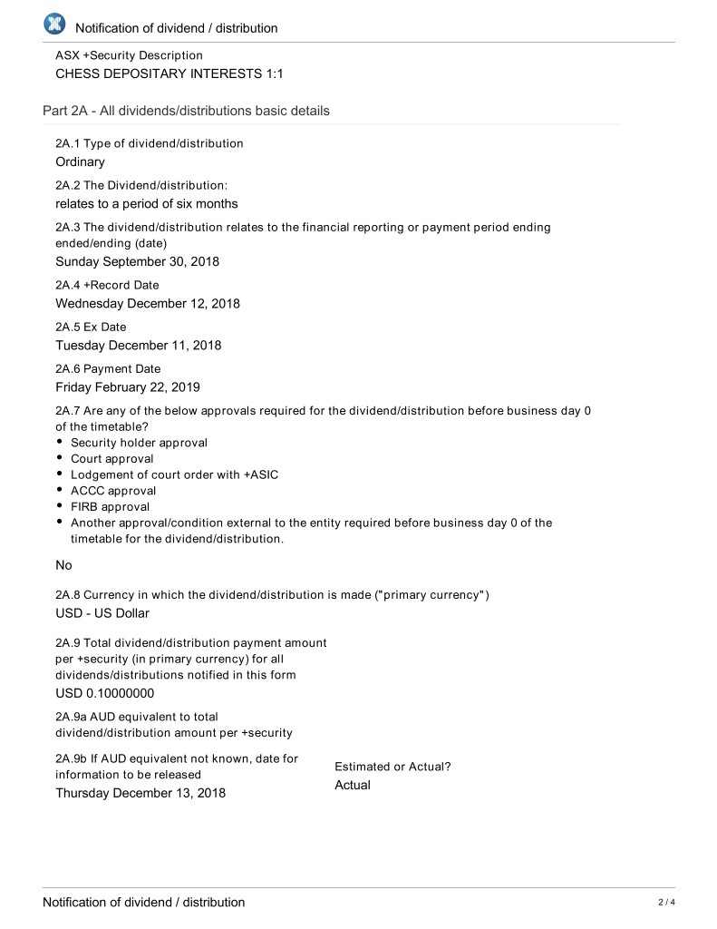 Notification of dividend / distribution ASX +Security Description CHESS DEPOSITARY INTERESTS 1:1 Part 2A - All dividends/distributions basic details 2A.1 Type of dividend/distribution Ordinary 2A.2 The Dividend/distribution: relates to a period of six months 2A.3 The dividend/distribution relates to the financial reporting or payment period ending ended/ending (date) Sunday September 30, 2018 2A.4 +Record Date Wednesday December 12, 2018 2A.5 Ex Date Tuesday December 11, 2018 2A.6 Payment Date Friday February 22, 2019 2A.7 Are any of the below approvals required for the dividend/distribution before business day 0 of the timetable? Security holder approval Court approval Lodgement of court order with +ASIC ACCC approval FIRB approval Another approval/condition external to the entity required before business day 0 of the timetable for the dividend/distribution. No 2A.8 Currency in which the dividend/distribution is made ("primary currency") USD - US Dollar 2A.9 Total dividend/distribution payment amount per +security (in primary currency) for all dividends/distributions notified in this form USD 0.10000000 2A.9a AUD equivalent to total dividend/distribution amount per +security 2A.9b If AUD equivalent not known, date for Estimated or Actual? information to be released Actual Thursday December 13, 2018 Notification of dividend / distribution 2 / 4