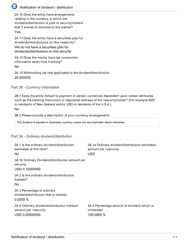 Notification of dividend / distribution 2A.10 Does the entity have arrangements relating to the currency in which the dividend/distribution is paid to securityholders that it wishes to disclose to the market? Yes 2A.11 Does the entity have a securities plan for dividends/distributions on this +security? We do not have a securities plan for dividends/distributions on this security 2A.12 Does the +entity have tax component information apart from franking? No 2A.13 Withholding tax rate applicable to the dividend/distribution 20.000000 Part 2B - Currency Information 2B.1 Does the entity default to payment in certain currencies dependent upon certain attributes such as the banking instruction or registered address of the +securityholder? (For example NZD to residents of New Zealand and/or USD to residents of the U.S.A.). No 2B.2 Please provide a description of your currency arrangements The dividend is payable in Australian currency unless the securityholder elects otherwise. Part 3A - Ordinary dividend/distribution 3A.1 Is the ordinary dividend/distribution 3A.1a Ordinary dividend/distribution estimated estimated at this time? amount per +security No USD 3A.1b Ordinary Dividend/distribution amount per security USD 0.10000000 3A.2 Is the ordinary dividend/distribution franked? No 3A.3 Percentage of ordinary dividend/distribution that is franked 0.0000 % 3A.4 Ordinary dividend/distribution franked 3A.5 Percentage amount of dividend which is amount per +security unfranked USD 0.00000000 100.0000 % Notification of dividend / distribution 3 / 4