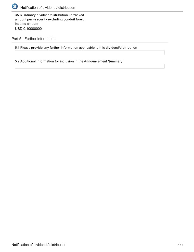 Notification of dividend / distribution 3A.6 Ordinary dividend/distribution unfranked amount per +security excluding conduit foreign income amount USD 0.10000000 Part 5 - Further information 5.1 Please provide any further information applicable to this dividend/distribution 5.2 Additional information for inclusion in the Announcement Summary Notification of dividend / distribution 4 / 4