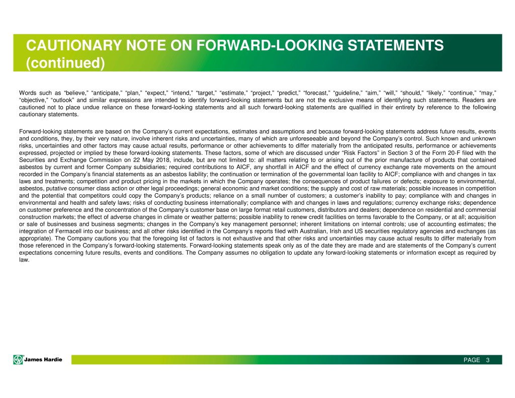 CAUTIONARY NOTE ON FORWARD-LOOKING STATEMENTS This Management Presentation contains forward-looking statements. James Hardie Industries plc (the “Company”) may from time to time make forward-looking statements in its periodic reports filed with or furnished to the Securities and Exchange Commission, on Forms 20-F and 6-K, in its annual reports to shareholders, in offering circulars, invitation memoranda and prospectuses, in media releases and other written materials and in oral statements made by the Company’s officers, directors or employees to analysts, institutional investors, existing and potential lenders, representatives of the media and others. Statements that are not historical facts are forward-looking statements and such forward-looking statements are statements made pursuant to the Safe Harbor Provisions of the Private Securities Litigation Reform Act of 1995. Examples of forward-looking statements include: • statements about the Company’s future performance; • projections of the Company’s results of operations or financial condition; • statements regarding the Company’s plans, objectives or goals, including those relating to strategies, initiatives, competition, acquisitions, dispositions and/or its products; • expectations concerning the costs associated with the suspension or closure of operations at any of the Company’s plants and future plans with respect to any such plants; • expectations concerning the costs associated with the significant capital expenditure projects at any of the Company’s plants and future plans with respect to any such projects; • expectations regarding the extension or renewal of the Company’s credit facilities including changes to terms, covenants or ratios; • expectations concerning dividend payments and share buy-backs; • statements concerning the Company’s corporate and tax domiciles and structures and potential changes to them, including potential tax charges; • statements regarding tax liabilities and related audits, reviews and proceedings; • statements regarding the possible consequences and/or potential outcome of legal proceedings brought against us and the potential liabilities, if any, associated with such proceedings; • expectations about the timing and amount of contributions to Asbestos Injuries Compensation Fund (AICF), a special purpose fund for the compensation of proven Australian asbestos-related personal injury and death claims; • expectations concerning the adequacy of the Company’s warranty provisions and estimates for future warranty-related costs; • statements regarding the Company’s ability to manage legal and regulatory matters (including but not limited to product liability, environmental, intellectual property and competition law matters) and to resolve any such pending legal and regulatory matters within current estimates and in anticipation of certain third-party recoveries; and • statements about economic conditions, such as changes in the US economic or housing recovery or changes in the market conditions in the Asia Pacific region, the levels of new home construction and home renovations, unemployment levels, changes in consumer income, changes or stability in housing values, the availability of mortgages and other financing, mortgage and other interest rates, housing affordability and supply, the levels of foreclosures and home resales, currency exchange rates, and builder and consumer confidence. PAGE 2