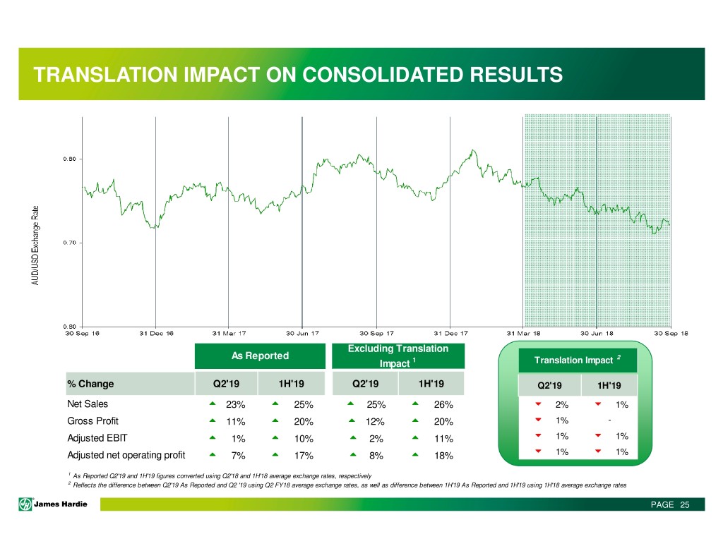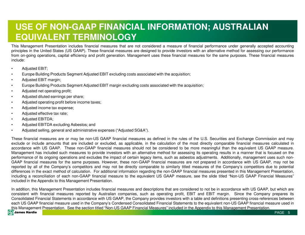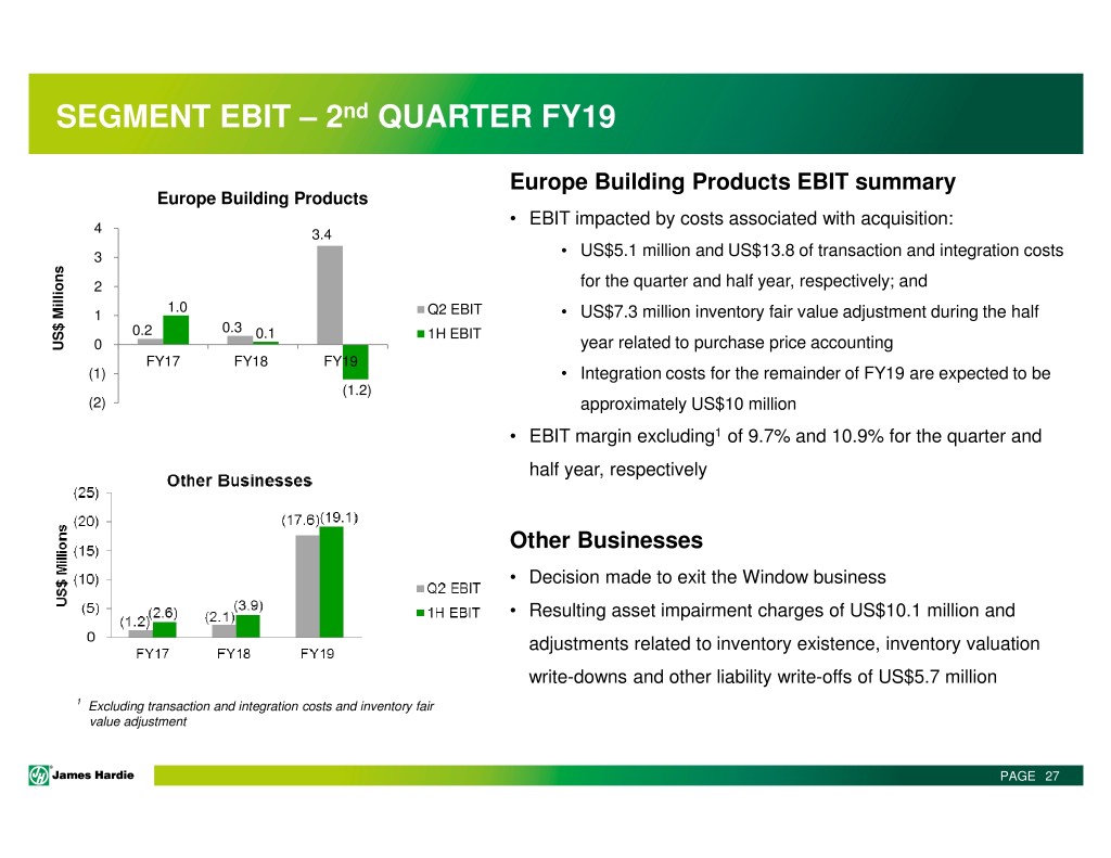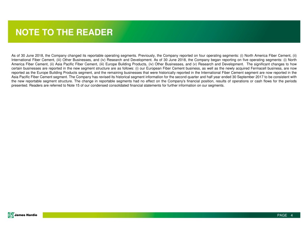 NOTE TO THE READER As of 30 June 2018, the Company changed its reportable operating segments. Previously, the Company reported on four operating segments: (i) North America Fiber Cement, (ii) International Fiber Cement, (iii) Other Businesses, and (iv) Research and Development. As of 30 June 2018, the Company began reporting on five operating segments: (i) North America Fiber Cement, (ii) Asia Pacific Fiber Cement, (iii) Europe Building Products, (iv) Other Businesses, and (v) Research and Development. The significant changes to how certain businesses are reported in the new segment structure are as follows: (i) our European Fiber Cement business, as well as the newly acquired Fermacell business, are now reported as the Europe Building Products segment, and the remaining businesses that were historically reported in the International Fiber Cement segment are now reported in the Asia Pacific Fiber Cement segment. The Company has revised its historical segment information for the second quarter and half year ended 30 September 2017 to be consistent with the new reportable segment structure. The change in reportable segments had no effect on the Company's financial position, results of operations or cash flows for the periods presented. Readers are referred to Note 15 of our condensed consolidated financial statements for further information on our segments. PAGE 4