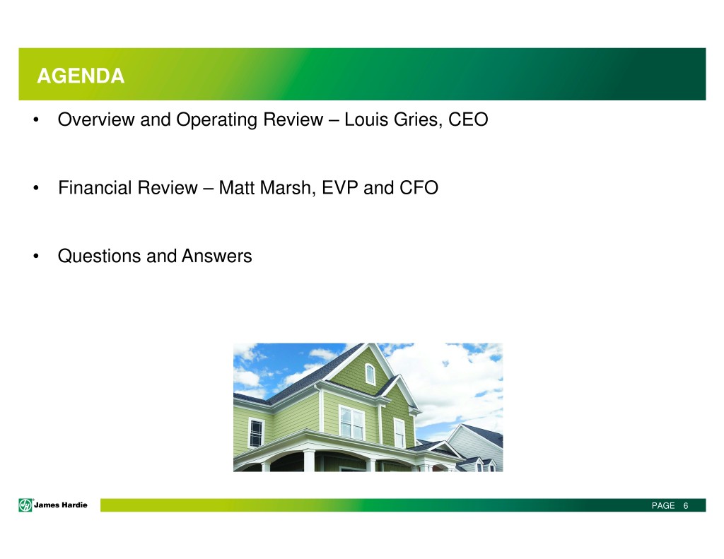 USE OF NON-GAAP FINANCIAL INFORMATION; AUSTRALIAN EQUIVALENT TERMINOLOGY This Management Presentation includes financial measures that are not considered a measure of financial performance under generally accepted accounting principles in the United States (US GAAP). These financial measures are designed to provide investors with an alternative method for assessing our performance from on-going operations, capital efficiency and profit generation. Management uses these financial measures for the same purposes. These financial measures include: • Adjusted EBIT; • Europe Building Products Segment Adjusted EBIT excluding costs associated with the acquisition; • Adjusted EBIT margin; • Europe Building Products Segment Adjusted EBIT margin excluding costs associated with the acquisition; • Adjusted net operating profit; • Adjusted diluted earnings per share; • Adjusted operating profit before income taxes; • Adjusted income tax expense; • Adjusted effective tax rate; • Adjusted EBITDA; • Adjusted EBITDA excluding Asbestos; and • Adjusted selling, general and administrative expenses (“Adjusted SG&A”). These financial measures are or may be non-US GAAP financial measures as defined in the rules of the U.S. Securities and Exchange Commission and may exclude or include amounts that are included or excluded, as applicable, in the calculation of the most directly comparable financial measures calculated in accordance with US GAAP. These non-GAAP financial measures should not be considered to be more meaningful than the equivalent US GAAP measure. Management has included such measures to provide investors with an alternative method for assessing its operating results in a manner that is focused on the performance of its ongoing operations and excludes the impact of certain legacy items, such as asbestos adjustments. Additionally, management uses such non- GAAP financial measures for the same purposes. However, these non-GAAP financial measures are not prepared in accordance with US GAAP, may not be reported by all of the Company’s competitors and may not be directly comparable to similarly titled measures of the Company’s competitors due to potential differences in the exact method of calculation. For additional information regarding the non-GAAP financial measures presented in this Management Presentation, including a reconciliation of each non-GAAP financial measure to the equivalent US GAAP measure, see the slide titled “Non-US GAAP Financial Measures” included in the Appendix to this Management Presentation. In addition, this Management Presentation includes financial measures and descriptions that are considered to not be in accordance with US GAAP, but which are consistent with financial measures reported by Australian companies, such as operating profit, EBIT and EBIT margin. Since the Company prepares its Consolidated Financial Statements in accordance with US GAAP, the Company provides investors with a table and definitions presenting cross-references between each US GAAP financial measure used in the Company’s Condensed Consolidated Financial Statements to the equivalent non-US GAAP financial measure used in this Management Presentation. See the section titled “Non-US GAAP Financial Measures” included in the Appendix to this Management Presentation. PAGE 5