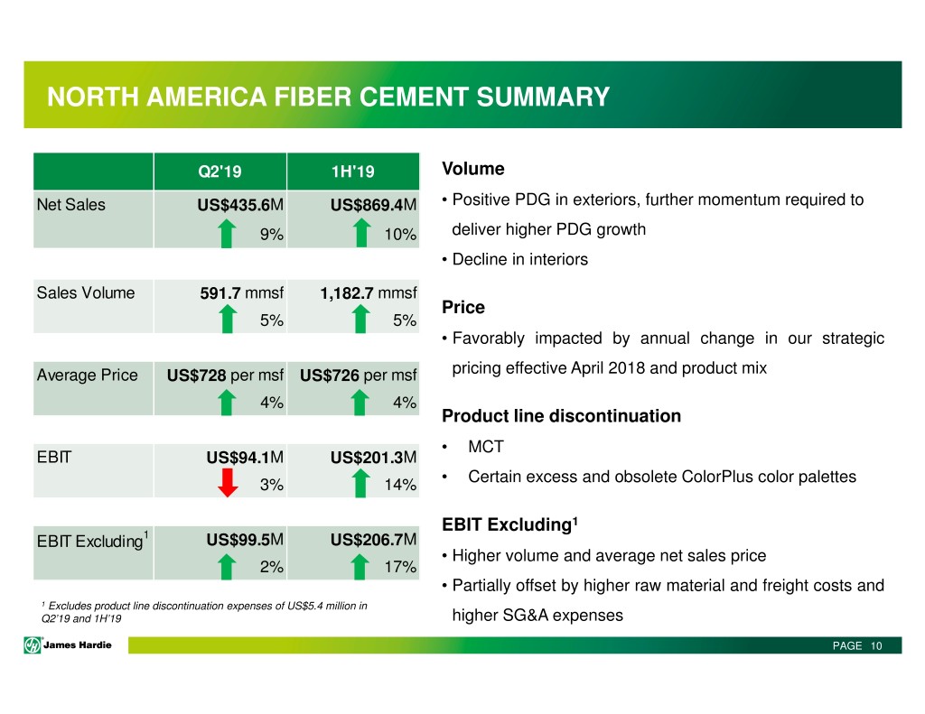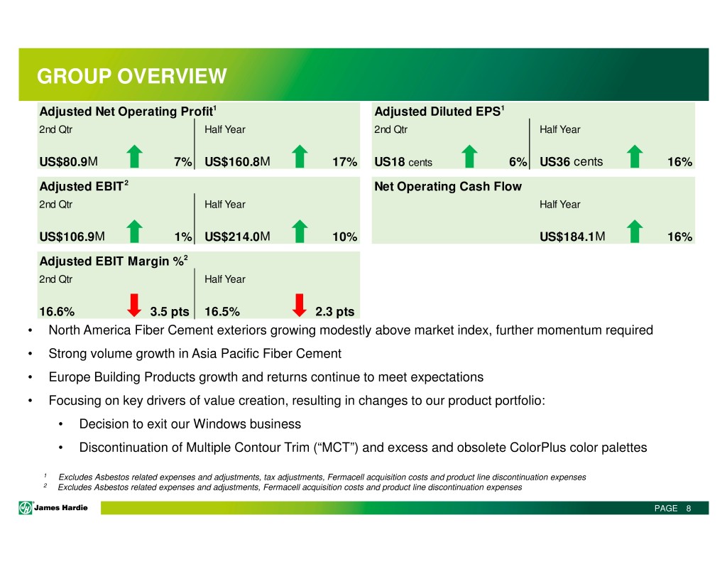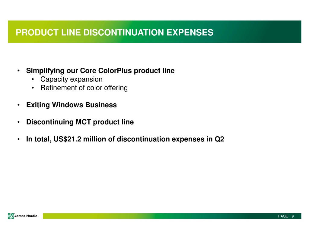 GROUP OVERVIEW Adjusted Net Operating Profit 1 Adjusted Diluted EPS 1 2nd Qtr Half Year 2nd Qtr Half Year US$80.9 M 7% US$160.8 M 17% US18 cents 6% US36 cents 16% Adjusted EBIT 2 Net Operating Cash Flow 2nd Qtr Half Year Half Year US$106.9 M 1% US$214.0 M 10% US$184.1 M 16% Adjusted EBIT Margin % 2 2nd Qtr Half Year 16.6% 3.5 pts 16.5% 2.3 pts • North America Fiber Cement exteriors growing modestly above market index, further momentum required • Strong volume growth in Asia Pacific Fiber Cement • Europe Building Products growth and returns continue to meet expectations • Focusing on key drivers of value creation, resulting in changes to our product portfolio: • Decision to exit our Windows business • Discontinuation of Multiple Contour Trim (“MCT”) and excess and obsolete ColorPlus color palettes 1 Excludes Asbestos related expenses and adjustments, tax adjustments, Fermacell acquisition costs and product line discontinuation expenses 2 Excludes Asbestos related expenses and adjustments, Fermacell acquisition costs and product line discontinuation expenses PAGE 8