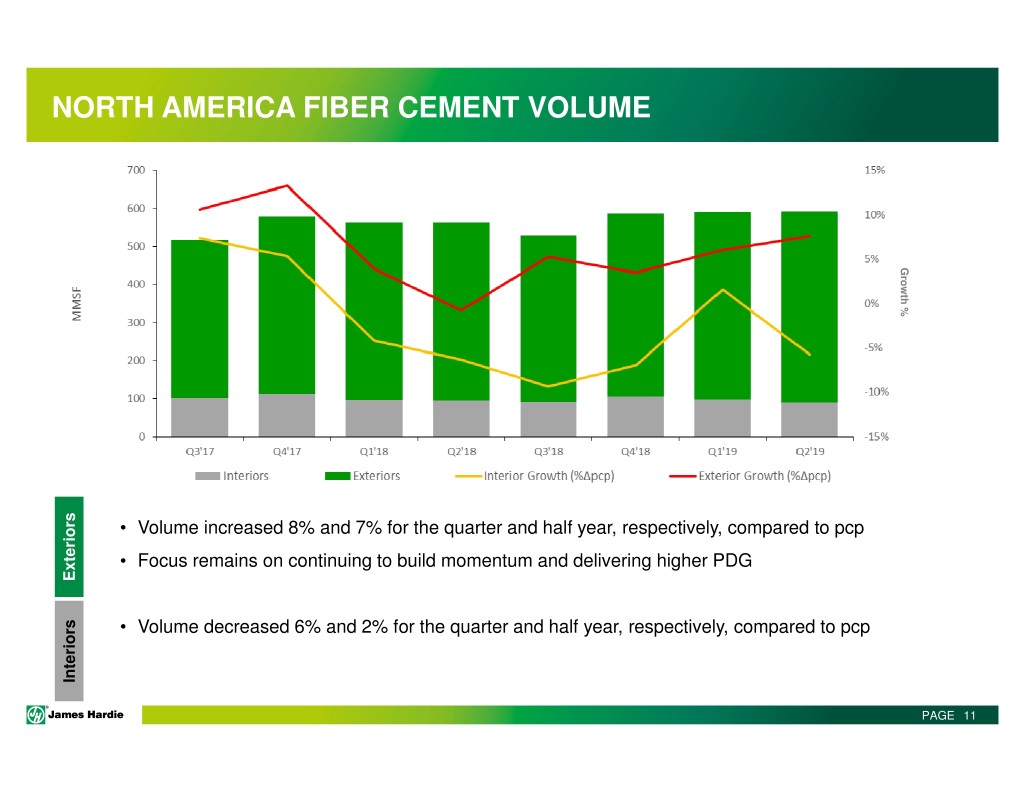 NORTH AMERICA FIBER CEMENT SUMMARY Q2'19 1H'19 Volume Net Sales US$435.6 M US$869.4 M • Positive PDG in exteriors, further momentum required to 9% 10% deliver higher PDG growth • Decline in interiors Sales Volume 591.7 mmsf 1,182.7 mmsf Price 5% 5% • Favorably impacted by annual change in our strategic Average Price US$728 per msf US$726 per msf pricing effective April 2018 and product mix 4% 4% Product line discontinuation • MCT EBIT US$94.1 M US$201.3 M • Certain excess and obsolete ColorPlus color palettes 3% 14% EBIT Excluding 1 EBIT Excluding 1 US$99.5 M US$206.7 M • Higher volume and average net sales price 2% 17% • Partially offset by higher raw material and freight costs and 1 Excludes product line discontinuation expenses of US$5.4 million in Q2’19 and 1H’19 higher SG&A expenses PAGE 10