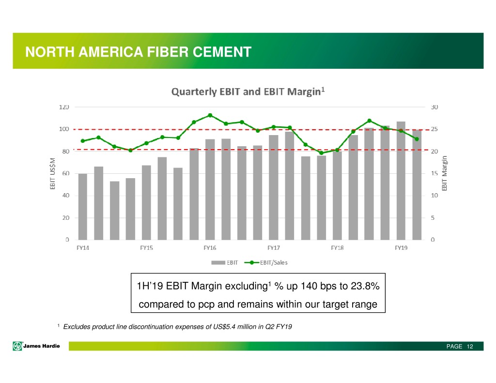 NORTH AMERICA FIBER CEMENT 1H’19 EBIT Margin excluding 1 % up 140 bps to 23.8% compared to pcp and remains within our target range 1 Excludes product line discontinuation expenses of US$5.4 million in Q2 FY19 PAGE 12