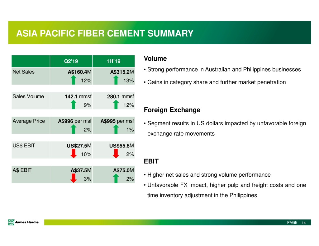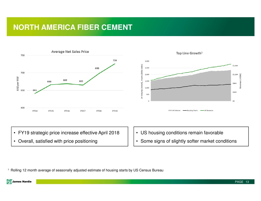 NORTH AMERICA FIBER CEMENT • FY19 strategic price increase effective April 2018 • US housing conditions remain favorable • Overall, satisfied with price positioning • Some signs of slightly softer market conditions 1 Rolling 12 month average of seasonally adjusted estimate of housing starts by US Census Bureau PAGE 13