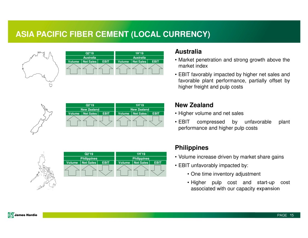 ASIA PACIFIC FIBER CEMENT SUMMARY Q2'19 1H'19 Volume Net Sales A$160.4 M A$315.2 M • Strong performance in Australian and Philippines businesses 12% 13% • Gains in category share and further market penetration Sales Volume 142.1 mmsf 280.1 mmsf 9% 12% Foreign Exchange Average Price A$996 per msf A$995 per msf • Segment results in US dollars impacted by unfavorable foreign 2% 1% exchange rate movements US$ EBIT US$27.5 M US$55.8 M 10% 2% EBIT A$ EBIT A$37.5 M A$75.0 M • Higher net sales and strong volume performance 3% 2% • Unfavorable FX impact, higher pulp and freight costs and one time inventory adjustment in the Philippines PAGE 14