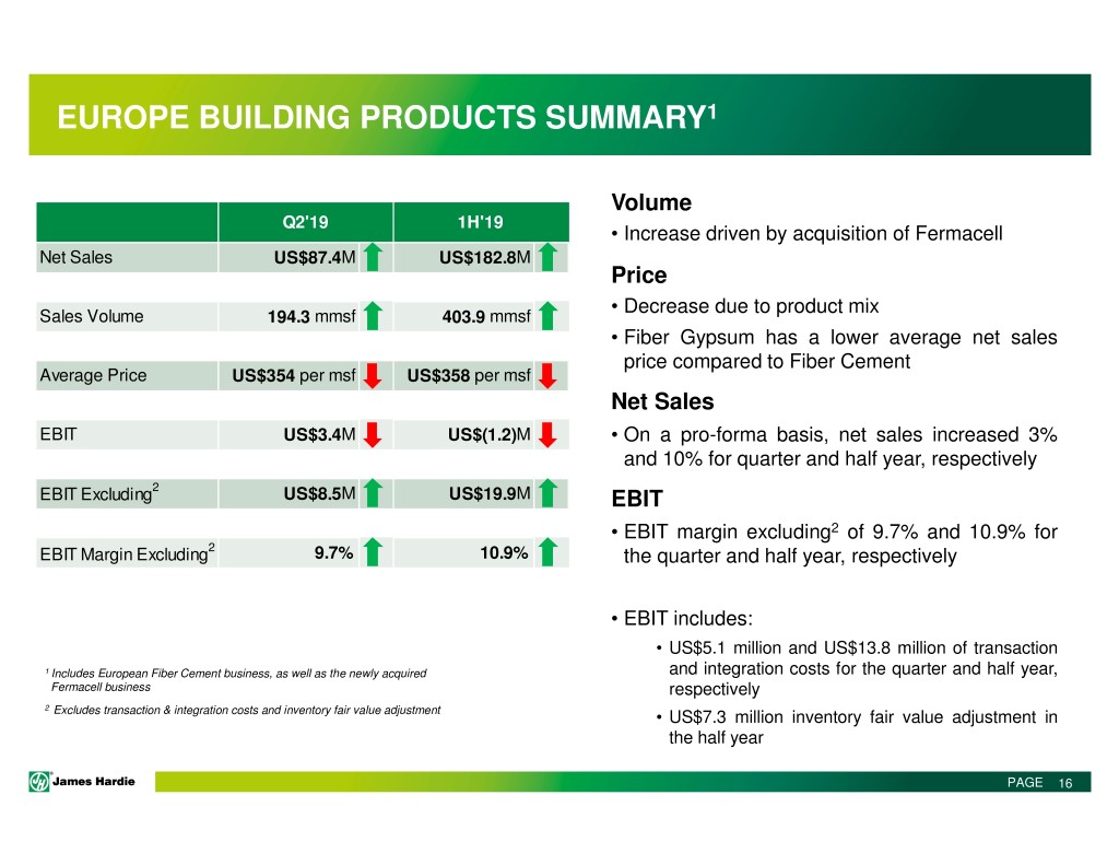 ASIA PACIFIC FIBER CEMENT (LOCAL CURRENCY) Q2'19 1H'19 Australia Australia Australia Volume Net Sales EBIT Volume Net Sales EBIT • Market penetration and strong growth above the market index • EBIT favorably impacted by higher net sales and favorable plant performance, partially offset by higher freight and pulp costs Q2'19 1H'19 New Zealand New Zealand New Zealand Volume Net Sales EBIT Volume Net Sales EBIT • Higher volume and net sales • EBIT compressed by unfavorable plant performance and higher pulp costs Philippines Q2'19 1H'19 Philippines Philippines • Volume increase driven by market share gains Volume Net Sales EBIT Volume Net Sales EBIT • EBIT unfavorably impacted by: • One time inventory adjustment • Higher pulp cost and start-up cost associated with our capacity expansion PAGE 15