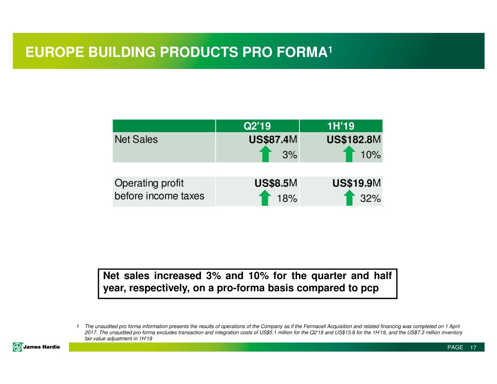 EUROPE BUILDING PRODUCTS PRO FORMA 1 Q2'19 1H'19 Net Sales US$87.4 M US$182.8 M 3% 10% Operating profit US$8.5 M US$19.9 M before income taxes 18% 32% Net sales increased 3% and 10% for the quarter and half year, respectively, on a pro-forma basis compared to pcp 1 The unaudited pro forma information presents the results of operations of the Company as if the Fermacell Acquisition and related financing was completed on 1 April 2017. The unaudited pro forma excludes transaction and integration costs of US$5.1 million for the Q2’19 and US$13.8 for the 1H’19, and the US$7.3 million inventory fair value adjustment in 1H’19 PAGE 17