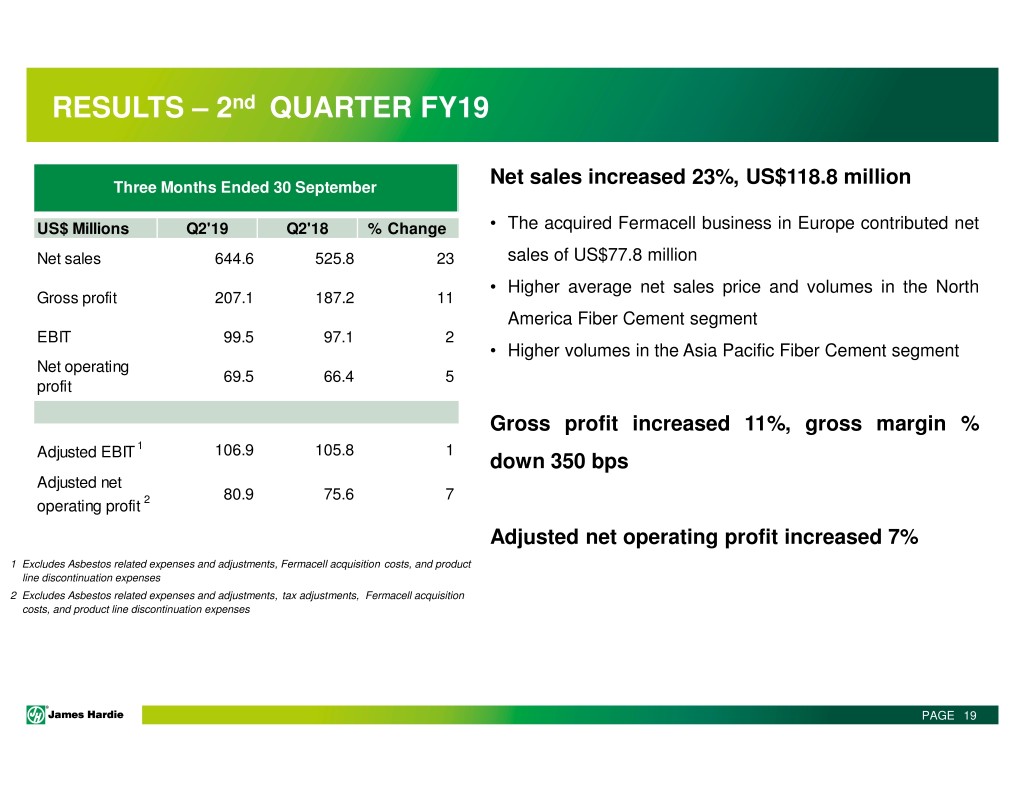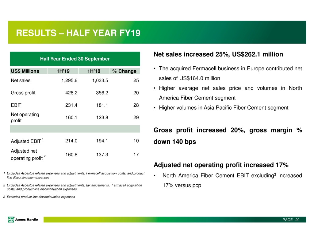 RESULTS – 2nd QUARTER FY19 Three Months Ended 30 September Net sales increased 23%, US$118.8 million US$ Millions Q2'19 Q2'18 % Change • The acquired Fermacell business in Europe contributed net Net sales 644.6 525.8 23 sales of US$77.8 million • Higher average net sales price and volumes in the North Gross profit 207.1 187.2 11 America Fiber Cement segment EBIT 99.5 97.1 2 • Higher volumes in the Asia Pacific Fiber Cement segment Net operating 69.5 66.4 5 profit Gross profit increased 11%, gross margin % 1 106.9 105.8 1 Adjusted EBIT down 350 bps Adjusted net 80.9 75.6 7 operating profit 2 Adjusted net operating profit increased 7% 1 Excludes Asbestos related expenses and adjustments, Fermacell acquisition costs, and product line discontinuation expenses 2 Excludes Asbestos related expenses and adjustments, tax adjustments, Fermacell acquisition costs, and product line discontinuation expenses PAGE 19