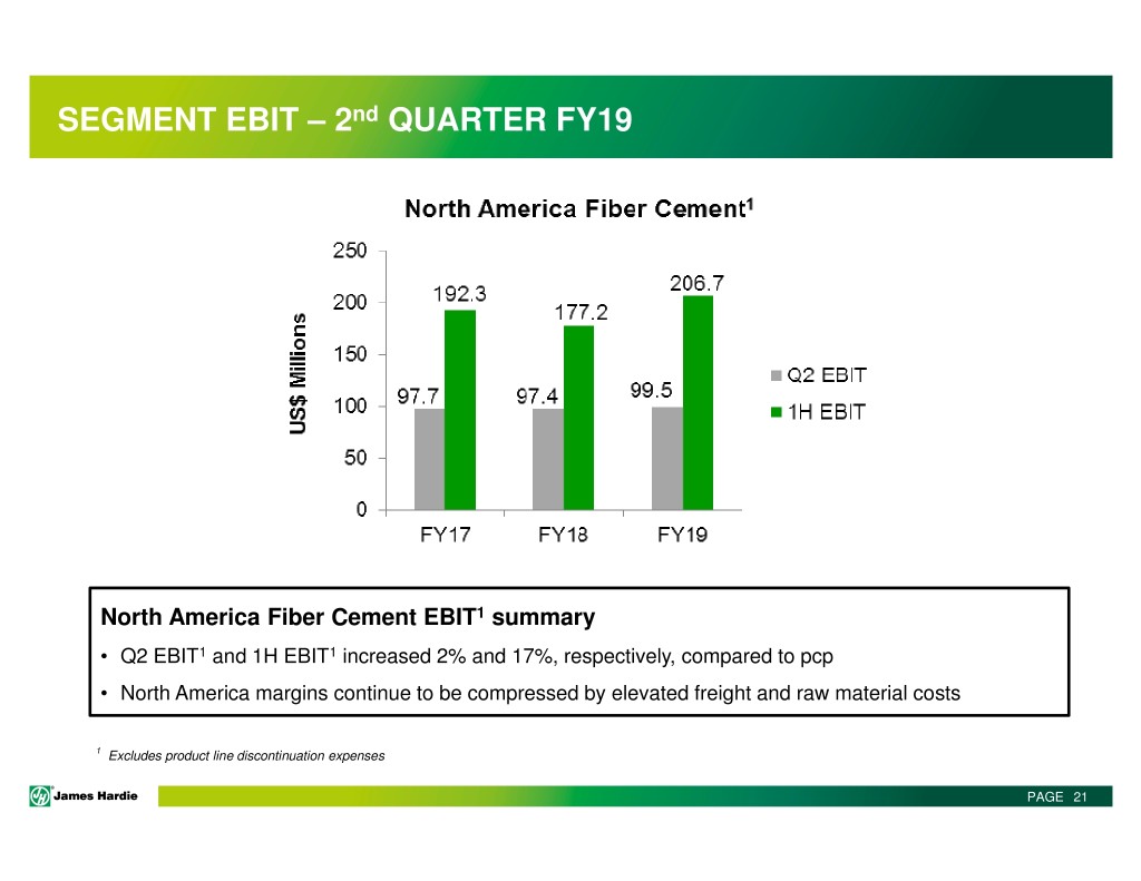 RESULTS – HALF YEAR FY19 Net sales increased 25%, US$262.1 million Half Year Ended 30 September US$ Millions 1H'19 1H'18 % Change • The acquired Fermacell business in Europe contributed net Net sales 1,295.6 1,033.5 25 sales of US$164.0 million • Higher average net sales price and volumes in North Gross profit 428.2 356.2 20 America Fiber Cement segment EBIT 231.4 181.1 28 • Higher volumes in Asia Pacific Fiber Cement segment Net operating 160.1 123.8 29 profit Gross profit increased 20%, gross margin % Adjusted EBIT 1 214.0 194.1 10 down 140 bps Adjusted net 160.8 137.3 17 operating profit 2 Adjusted net operating profit increased 17% 1 Excludes Asbestos related expenses and adjustments, Fermacell acquisition costs, and product 3 line discontinuation expenses • North America Fiber Cement EBIT excluding increased 2 Excludes Asbestos related expenses and adjustments, tax adjustments, Fermacell acquisition 17% versus pcp costs, and product line discontinuation expenses 3 Excludes product line discontinuation expenses PAGE 20