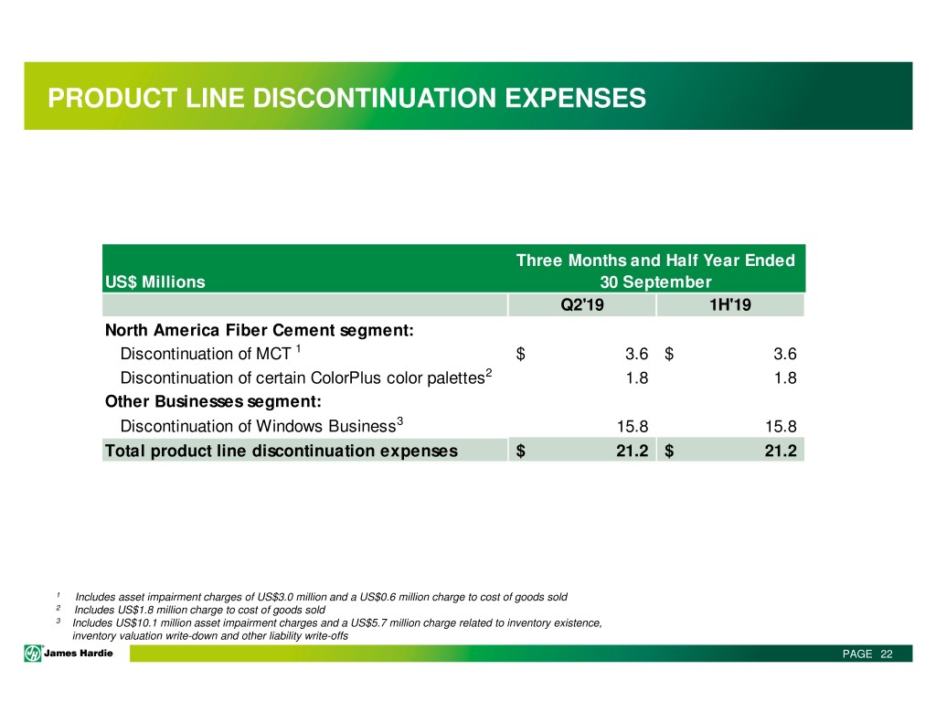 PRODUCT LINE DISCONTINUATION EXPENSES Three Months and Half Year Ended US$ Millions 30 September Q2'19 1H'19 North America Fiber Cement segment: Discontinuation of MCT 1 $ 3.6 $ 3.6 Discontinuation of certain ColorPlus color palettes 2 1.8 1.8 Other Businesses segment: Discontinuation of Windows Business 3 15.8 15.8 Total product line discontinuation expenses $ 21.2 $ 21.2 1 Includes asset impairment charges of US$3.0 million and a US$0.6 million charge to cost of goods sold 2 Includes US$1.8 million charge to cost of goods sold 3 Includes US$10.1 million asset impairment charges and a US$5.7 million charge related to inventory existence, inventory valuation write-down and other liability write-offs PAGE 22