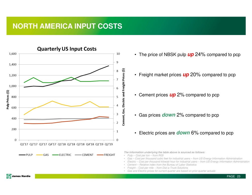 NORTH AMERICA INPUT COSTS • The price of NBSK pulp up 24% compared to pcp • Freight market prices up 20% compared to pcp • Cement prices up 2% compared to pcp • Gas prices down 2% compared to pcp • Electric prices are down 6% compared to pcp The information underlying the table above is sourced as follows: • Pulp – Cost per ton – from RISI • Gas – Cost per thousand cubic feet for industrial users – from US Energy Information Administration • Electric – Cost per thousand kilowatt hour for industrial users – from US Energy Information Administration • Cement – Relative index from the Bureau of Labor Statistics • Freight – Cost per mile – from Dial-a-Truck Solutions • Gas and Electric prices for current quarter are based on prior quarter actuals PAGE 23