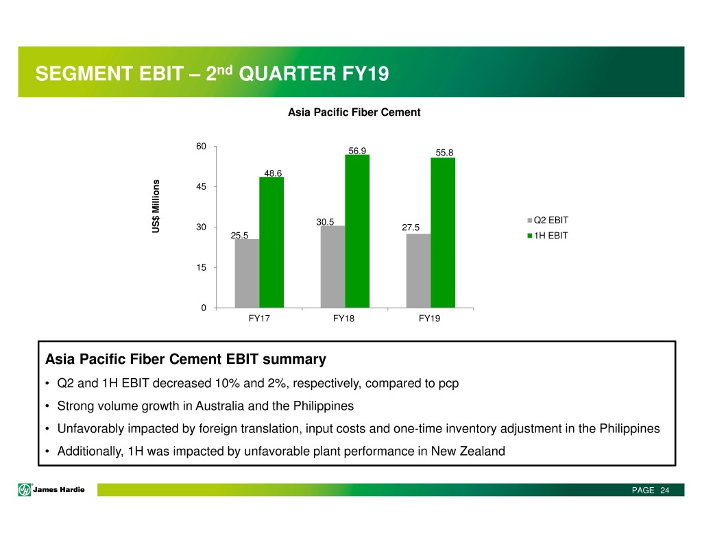 SEGMENT EBIT – 2nd QUARTER FY19 Asia Pacific Fiber Cement 60 56.9 55.8 48.6 45 30.5 Q2 EBIT 30 27.5 US$ Millions US$ 25.5 1H EBIT 15 0 FY17 FY18 FY19 Asia Pacific Fiber Cement EBIT summary • Q2 and 1H EBIT decreased 10% and 2%, respectively, compared to pcp • Strong volume growth in Australia and the Philippines • Unfavorably impacted by foreign translation, input costs and one-time inventory adjustment in the Philippines • Additionally, 1H was impacted by unfavorable plant performance in New Zealand PAGE 24