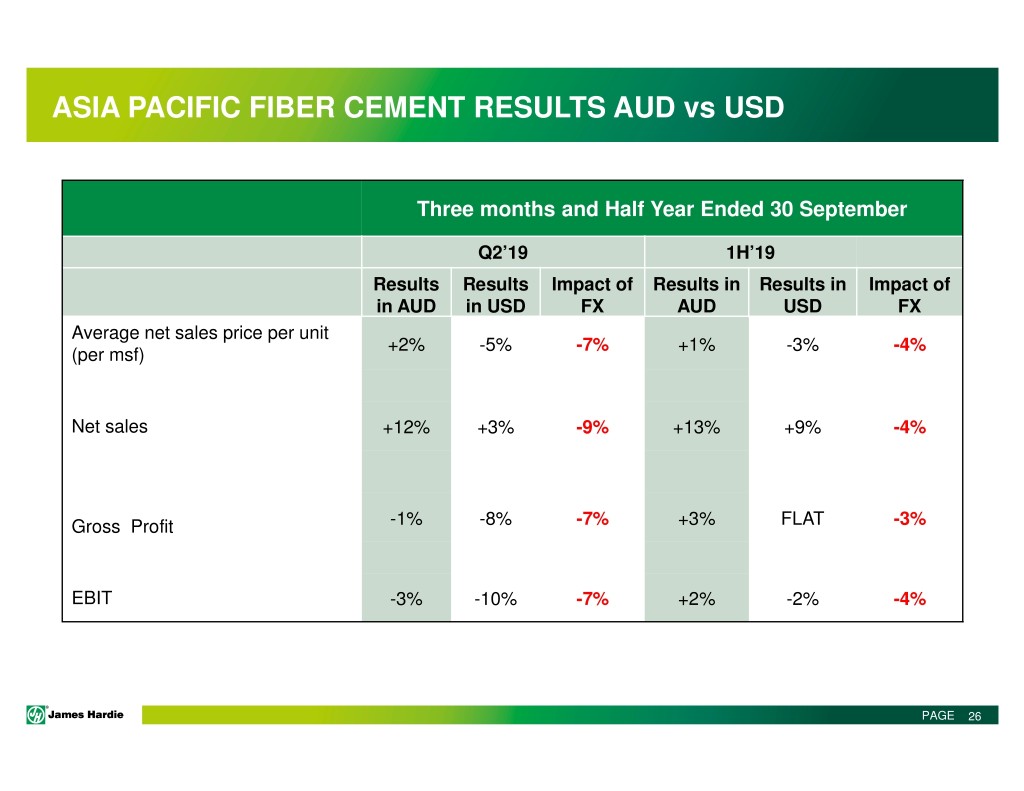 ASIA PACIFIC FIBER CEMENT RESULTS AUD vs USD Three months and Half Year Ended 30 September Q2’19 1H’19 Results Results Impact of Results in Results in Impact of in AUD in USD FX AUD USD FX Average net sales price per unit +2% -5% -7% +1% -3% -4% (per msf) Net sales +12% +3% -9% +13% +9% -4% Gross Profit -1% -8% -7% +3% FLAT -3% EBIT -3% -10% -7% +2% -2% -4% PAGE 26