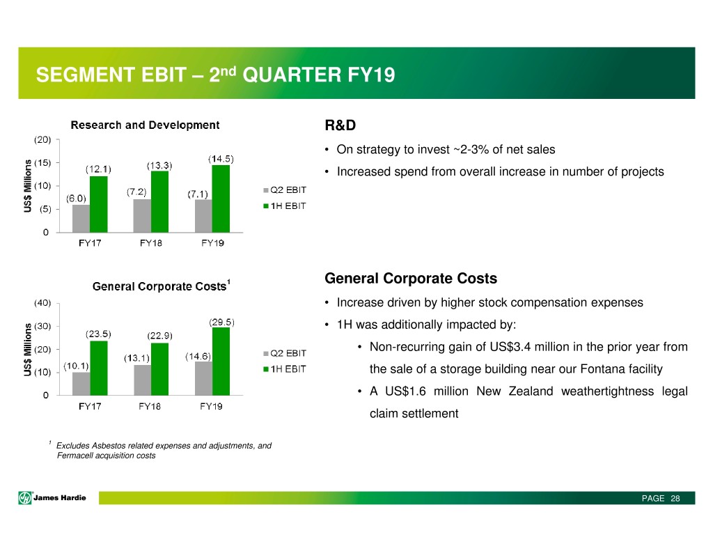 SEGMENT EBIT – 2nd QUARTER FY19 R&D • On strategy to invest ~2-3% of net sales • Increased spend from overall increase in number of projects General Corporate Costs • Increase driven by higher stock compensation expenses • 1H was additionally impacted by: • Non-recurring gain of US$3.4 million in the prior year from the sale of a storage building near our Fontana facility • A US$1.6 million New Zealand weathertightness legal claim settlement 1 Excludes Asbestos related expenses and adjustments, and Fermacell acquisition costs PAGE 28