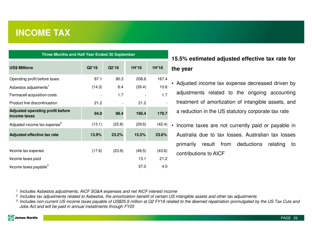 INCOME TAX Three Months and Half Year Ended 30 September 15.5% estimated adjusted effective tax rate for US$ Millions Q2’19 Q2’18 1H'19 1H'18 the year Operating profit before taxes 87.1 90.3 208.6 167.4 • Adjusted income tax expense decreased driven by Asbestos adjustments 1 (14.3) 6.4 (39.4) 10.6 Fermacell acquisition costs - 1.7 - 1.7 adjustments related to the ongoing accounting Product line discontinuation 21.2 - 21.2 - treatment of amortization of intangible assets, and Adjusted operating profit before 94.0 98.4 190.4 179.7 a reduction in the US statutory corporate tax rate income taxes Adjusted income tax expense 2 (13.1) (22.8) (29.6) (42.4) • Income taxes are not currently paid or payable in Adjusted effective tax rate 13.9% 23.2% 15.5% 23.6% Australia due to tax losses. Australian tax losses primarily result from deductions relating to Income tax expense (17.6) (23.9) (48.5) (43.6) contributions to AICF Income taxes paid 13.1 21.2 Income taxes payable 3 37.0 4.0 1 Includes Asbestos adjustments, AICF SG&A expenses and net AICF interest income 2 Includes tax adjustments related to Asbestos, the amortization benefit of certain US intangible assets and other tax adjustments 3 Includes non-current US income taxes payable of US$25.9 million at Q2 FY19 related to the deemed repatriation promulgated by the US Tax Cuts and Jobs Act and will be paid in annual installments through FY25 PAGE 29