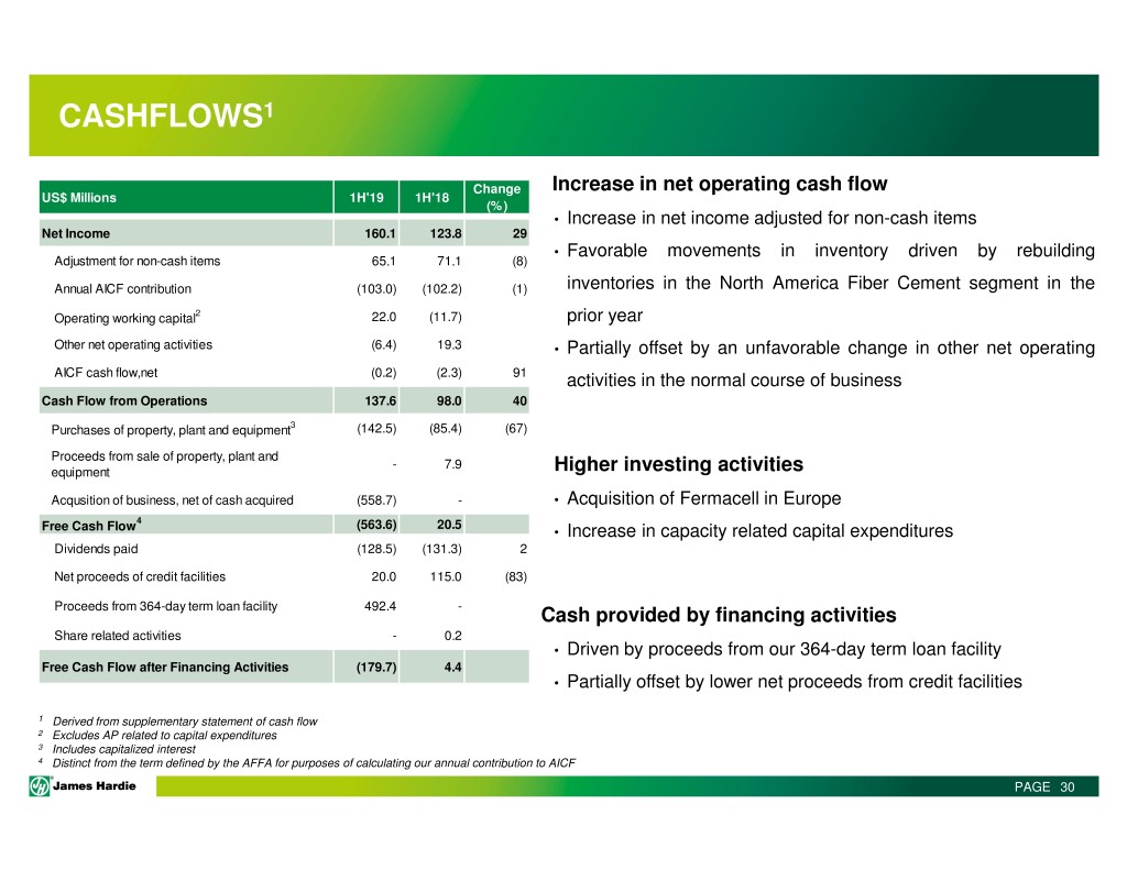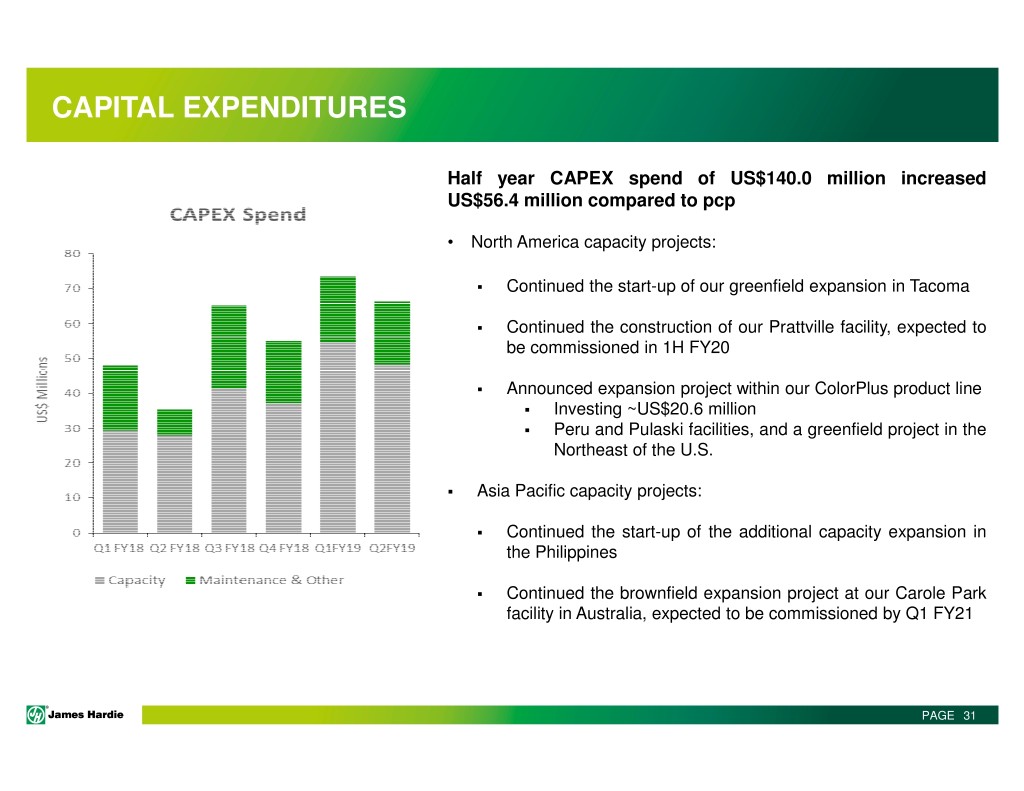 CASHFLOWS 1 Change Increase in net operating cash flow US$ Millions 1H'19 1H'18 (%) • Increase in net income adjusted for non-cash items Net Income 160.1 123.8 29 • Favorable movements in inventory driven by rebuilding Adjustment for non-cash items 1 65.1 71.1 (8) Annual AICF contribution (103.0) (102.2) (1) inventories in the North America Fiber Cement segment in the Operating working capital 2 22.0 (11.7) prior year Other net operating activities (6.4) 19.3 • Partially offset by an unfavorable change in other net operating AICF cash flow,net (0.2) (2.3) 91 activities in the normal course of business Cash Flow from Operations 137.6 98.0 40 Purchases of property, plant and equipment 3 (142.5) (85.4) (67) Proceeds from sale of property, plant and - 7.9 equipment Higher investing activities Acqusition of business, net of cash acquired (558.7) - • Acquisition of Fermacell in Europe 4 (563.6) 20.5 Free Cash Flow • Increase in capacity related capital expenditures Dividends paid (128.5) (131.3) 2 Net proceeds of credit facilities 20.0 115.0 (83) Proceeds from 364-day term loan facility 492.4 - Cash provided by financing activities Share related activities - 0.2 • Driven by proceeds from our 364-day term loan facility Free Cash Flow after Financing Activities (179.7) 4.4 • Partially offset by lower net proceeds from credit facilities 1 Derived from supplementary statement of cash flow 2 Excludes AP related to capital expenditures 3 Includes capitalized interest 4 Distinct from the term defined by the AFFA for purposes of calculating our annual contribution to AICF PAGE 30