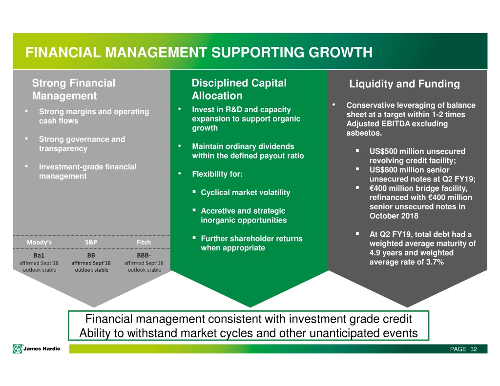 FINANCIAL MANAGEMENT SUPPORTING GROWTH Strong Financial Disciplined Capital Liquidity and Funding Management Allocation • Conservative leveraging of balance • Invest in R&D and capacity • Strong margins and operating sheet at a target within 1-2 times expansion to support organic cash flows Adjusted EBITDA excluding growth asbestos. • Strong governance and • Maintain ordinary dividends transparency US$500 million unsecured within the defined payout ratio revolving credit facility; • Investment-grade financial US$800 million senior • Flexibility for: management unsecured notes at Q2 FY19; €400 million bridge facility, Cyclical market volatility refinanced with €400 million senior unsecured notes in Accretive and strategic October 2018 inorganic opportunities At Q2 FY19, total debt had a Further shareholder returns Moody’s S&P Fitch weighted average maturity of when appropriate Ba1 BB BBB- 4.9 years and weighted affirmed Sept’18 affirmed Sept’18 affirmed Sept’18 average rate of 3.7% outlook stable outlook stable outlook stable Financial management consistent with investment grade credit Ability to withstand market cycles and other unanticipated events PAGE 32