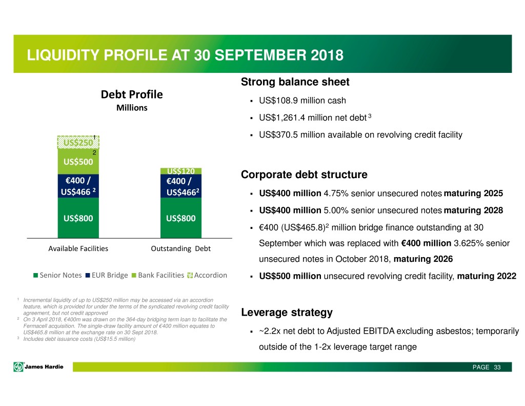 LIQUIDITY PROFILE AT 30 SEPTEMBER 2018 Strong balance sheet Debt Profile US$108.9 million cash Millions US$1,261.4 million net debt 3 1 US$370.5 million available on revolving credit facility US$250 2 US$500 US$120 Corporate debt structure €400 / €400 / 2 2 US$466 US$466 US$400 million 4.75% senior unsecured notes maturing 2025 US$400 million 5.00% senior unsecured notes maturing 2028 US$800 US$800 €400 (US$465.8) 2 million bridge finance outstanding at 30 September which was replaced with €400 million 3.625% senior Available Facilities Outstanding Debt unsecured notes in October 2018, maturing 2026 Senior Notes EUR Bridge Bank Facilities Accordion US$500 million unsecured revolving credit facility, maturing 2022 1 Incremental liquidity of up to US$250 million may be accessed via an accordion feature, which is provided for under the terms of the syndicated revolving credit facility agreement, but not credit approved Leverage strategy 2 On 3 April 2018, €400m was drawn on the 364-day bridging term loan to facilitate the Fermacell acquisition. The single-draw facility amount of €400 million equates to US$465.8 million at the exchange rate on 30 Sept 2018. ~2.2x net debt to Adjusted EBITDA excluding asbestos; temporarily 3 Includes debt issuance costs (US$15.5 million) outside of the 1-2x leverage target range PAGE 33