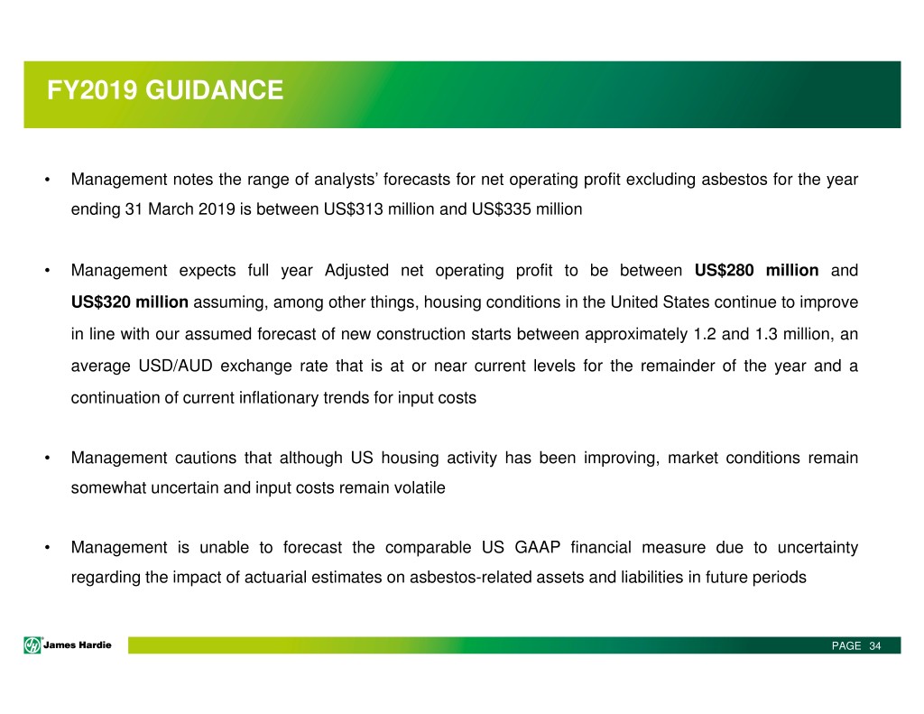 FY2019 GUIDANCE • Management notes the range of analysts’ forecasts for net operating profit excluding asbestos for the year ending 31 March 2019 is between US$313 million and US$335 million • Management expects full year Adjusted net operating profit to be between US$280 million and US$320 million assuming, among other things, housing conditions in the United States continue to improve in line with our assumed forecast of new construction starts between approximately 1.2 and 1.3 million, an average USD/AUD exchange rate that is at or near current levels for the remainder of the year and a continuation of current inflationary trends for input costs • Management cautions that although US housing activity has been improving, market conditions remain somewhat uncertain and input costs remain volatile • Management is unable to forecast the comparable US GAAP financial measure due to uncertainty regarding the impact of actuarial estimates on asbestos-related assets and liabilities in future periods PAGE 34