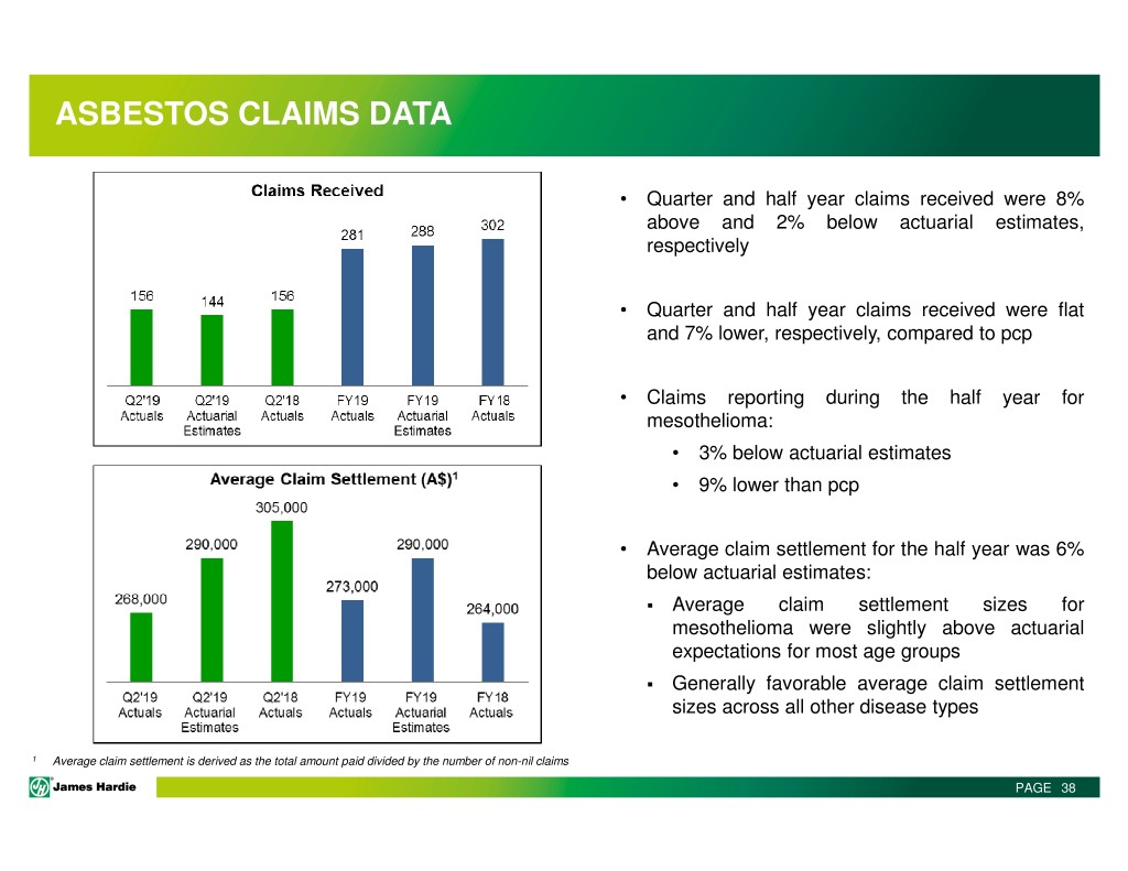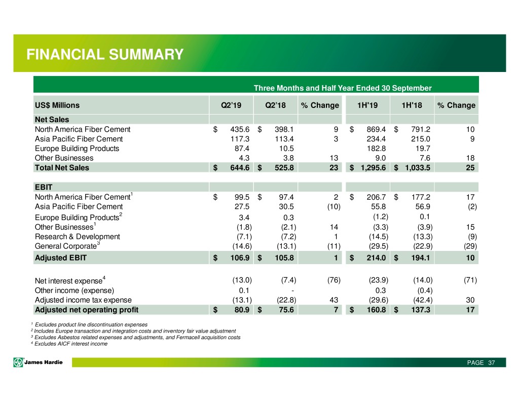 FINANCIAL SUMMARY Three Months and Half Year Ended 30 September US$ Millions Q2’19 Q2’18 % Change 1H'19 1H'18 % Change Net Sales North America Fiber Cement$ 435.6 $ 398.1 9$ 869.4 $ 791.2 10 Asia Pacific Fiber Cement 117.3 113.4 3 234.4 215.0 9 Europe Building Products 87.4 10.5 182.8 19.7 Other Businesses 4.3 3.8 13 9.0 7.6 18 Total Net Sales $ 644.6 $ 525.8 23$ 1,295.6 $ 1,033.5 25 EBIT North America Fiber Cement 1 $ 99.5 $ 97.4 2$ 206.7 $ 177.2 17 Asia Pacific Fiber Cement 27.5 30.5 (10) 55.8 56.9 (2) Europe Building Products 2 3.4 0.3 (1.2) 0.1 Other Businesses 1 (1.8) (2.1) 14 (3.3) (3.9) 15 Research & Development (7.1) (7.2) 1 (14.5) (13.3) (9) General Corporate 3 (14.6) (13.1) (11) (29.5) (22.9) (29) Adjusted EBIT $ 106.9 $ 105.8 1$ 214.0 $ 194.1 10 Net interest expense 4 (13.0) (7.4) (76) (23.9) (14.0) (71) Other income (expense) 0.1 - 0.3 (0.4) Adjusted income tax expense (13.1) (22.8) 43 (29.6) (42.4) 30 Adjusted net operating profit$ 80.9 $ 75.6 7 $ 160.8 $ 137.3 17 1 Excludes product line discontinuation expenses 2 Includes Europe transaction and integration costs and inventory fair value adjustment 3 Excludes Asbestos related expenses and adjustments, and Fermacell acquisition costs 4 Excludes AICF interest income PAGE 37