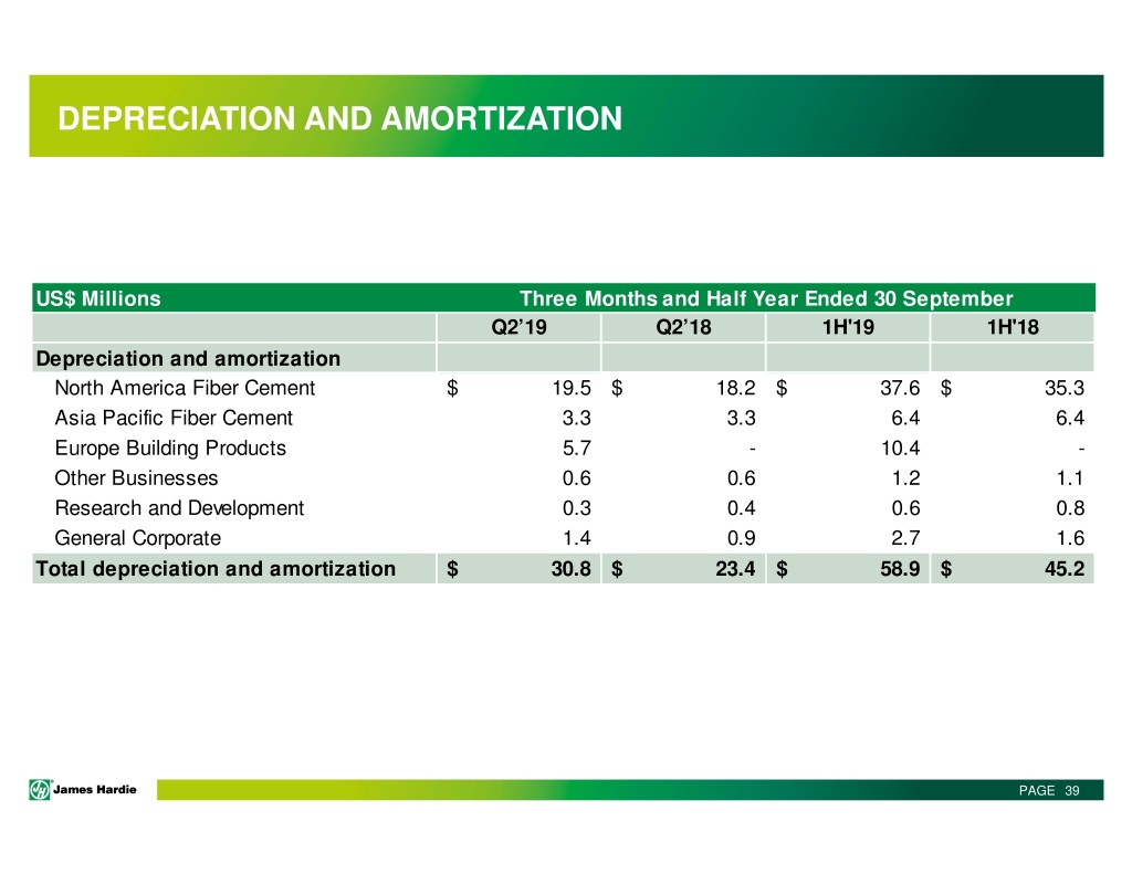 DEPRECIATION AND AMORTIZATION US$ Millions Three Months and Half Year Ended 30 September Q2’19 Q2’18 1H'19 1H'18 Depreciation and amortization North America Fiber Cement$ 19.5 $ 18.2 $ 37.6 $ 35.3 Asia Pacific Fiber Cement 3.3 3.3 6.4 6.4 Europe Building Products 5.7 - 10.4 - Other Businesses 0.6 0.6 1.2 1.1 Research and Development 0.3 0.4 0.6 0.8 General Corporate 1.4 0.9 2.7 1.6 Total depreciation and amortization$ 30.8 $ 23.4 $ 58.9 $ 45.2 PAGE 39