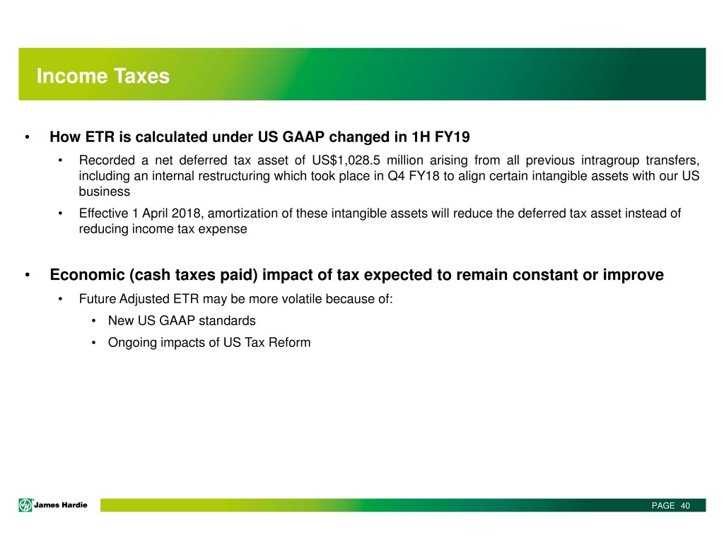 Income Taxes • How ETR is calculated under US GAAP changed in 1H FY19 • Recorded a net deferred tax asset of US$1,028.5 million arising from all previous intragroup transfers, including an internal restructuring which took place in Q4 FY18 to align certain intangible assets with our US business • Effective 1 April 2018, amortization of these intangible assets will reduce the deferred tax asset instead of reducing income tax expense • Economic (cash taxes paid) impact of tax expected to remain constant or improve • Future Adjusted ETR may be more volatile because of: • New US GAAP standards • Ongoing impacts of US Tax Reform PAGE 40