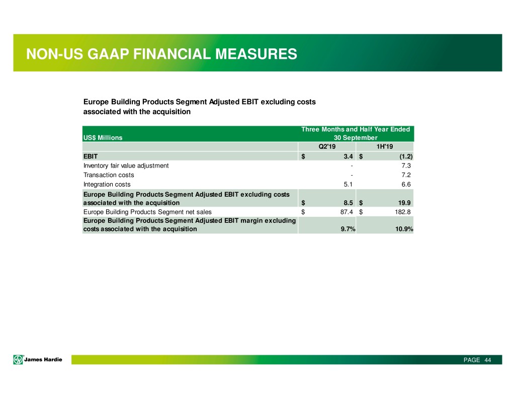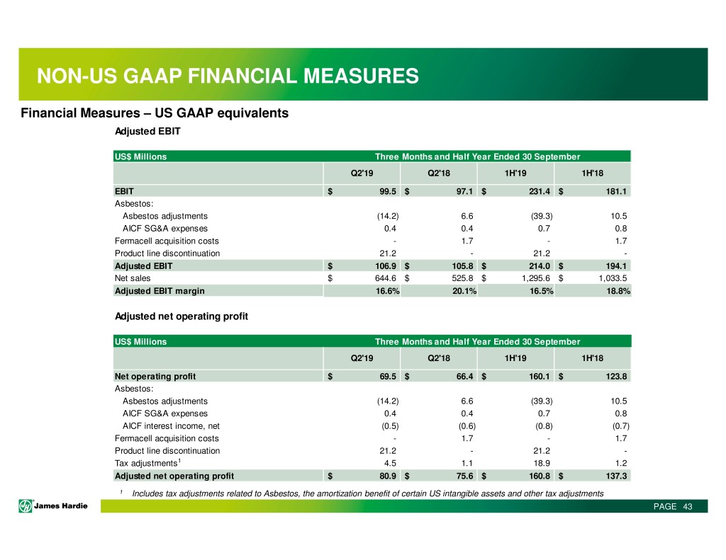 NON-US GAAP FINANCIAL MEASURES Financial Measures – US GAAP equivalents Adjusted EBIT US$ Millions Three Months and Half Year Ended 30 September Q2'19 Q2'18 1H'19 1H'18 EBIT $ 99.5 $ 97.1 $ 231.4 $ 181.1 Asbestos: Asbestos adjustments (14.2) 6.6 (39.3) 10.5 AICF SG&A expenses 0.4 0.4 0.7 0.8 Fermacell acquisition costs - 1.7 - 1.7 Product line discontinuation 21.2 - 21.2 - Adjusted EBIT $ 106.9 $ 105.8 $ 214.0 $ 194.1 Net sales $ 644.6 $ 525.8 $ 1,295.6 $ 1,033.5 Adjusted EBIT margin 16.6% 20.1% 16.5% 18.8% Adjusted net operating profit US$ Millions Three Months and Half Year Ended 30 September Q2'19 Q2'18 1H'19 1H'18 Net operating profit $ 69.5 $ 66.4 $ 160.1 $ 123.8 Asbestos: Asbestos adjustments (14.2) 6.6 (39.3) 10.5 AICF SG&A expenses 0.4 0.4 0.7 0.8 AICF interest income, net (0.5) (0.6) (0.8) (0.7) Fermacell acquisition costs - 1.7 - 1.7 Product line discontinuation 21.2 - 21.2 - Tax adjustments 1 4.5 1.1 18.9 1.2 Adjusted net operating profit $ 80.9 $ 75.6 $ 160.8 $ 137.3 1 Includes tax adjustments related to Asbestos, the amortization benefit of certain US intangible assets and other tax adjustments PAGE 43