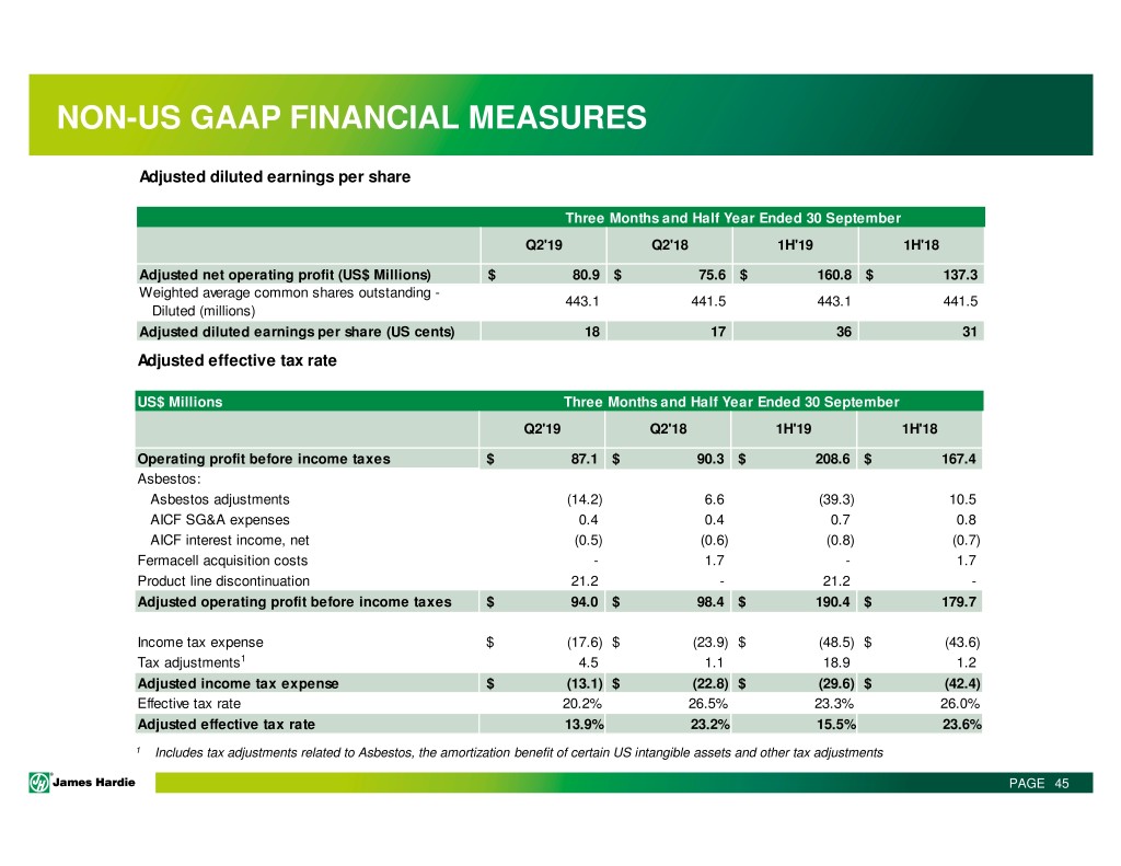 NON-US GAAP FINANCIAL MEASURES Adjusted diluted earnings per share Three Months and Half Year Ended 30 September Q2'19 Q2'18 1H'19 1H'18 Adjusted net operating profit (US$ Millions) $ 80.9 $ 75.6 $ 160.8 $ 137.3 Weighted average common shares outstanding - 443.1 441.5 443.1 441.5 Diluted (millions) Adjusted diluted earnings per share (US cents) 18 17 36 31 Adjusted effective tax rate US$ Millions Three Months and Half Year Ended 30 September Q2'19 Q2'18 1H'19 1H'18 Operating profit before income taxes$ 87.1 $ 90.3 $ 208.6 $ 167.4 Asbestos: Asbestos adjustments (14.2) 6.6 (39.3) 10.5 AICF SG&A expenses 0.4 0.4 0.7 0.8 AICF interest income, net (0.5) (0.6) (0.8) (0.7) Fermacell acquisition costs - 1.7 - 1.7 Product line discontinuation 21.2 - 21.2 - Adjusted operating profit before income taxes $ 94.0 $ 98.4 $ 190.4 $ 179.7 Income tax expense $ (17.6) $ (23.9) $ (48.5) $ (43.6) Tax adjustments 1 4.5 1.1 18.9 1.2 Adjusted income tax expense $ (13.1) $ (22.8) $ (29.6) $ (42.4) Effective tax rate 20.2% 26.5% 23.3% 26.0% Adjusted effective tax rate 13.9% 23.2% 15.5% 23.6% 1 Includes tax adjustments related to Asbestos, the amortization benefit of certain US intangible assets and other tax adjustments PAGE 45