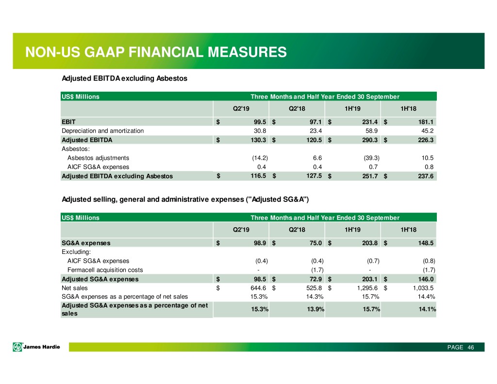 NON-US GAAP FINANCIAL MEASURES Adjusted EBITDA excluding Asbestos US$ Millions Three Months and Half Year Ended 30 September Q2'19 Q2'18 1H'19 1H'18 EBIT $ 99.5 $ 97.1 $ 231.4 $ 181.1 Depreciation and amortization 30.8 23.4 58.9 45.2 Adjusted EBITDA $ 130.3 $ 120.5 $ 290.3 $ 226.3 Asbestos: Asbestos adjustments (14.2) 6.6 (39.3) 10.5 AICF SG&A expenses 0.4 0.4 0.7 0.8 Adjusted EBITDA excluding Asbestos $ 116.5 $ 127.5 $ 251.7 $ 237.6 Adjusted selling, general and administrative expenses ("Adjusted SG&A") US$ Millions Three Months and Half Year Ended 30 September Q2'19 Q2'18 1H'19 1H'18 SG&A expenses $ 98.9 $ 75.0 $ 203.8 $ 148.5 Excluding: AICF SG&A expenses (0.4) (0.4) (0.7) (0.8) Fermacell acquisition costs - (1.7) - (1.7) Adjusted SG&A expenses $ 98.5 $ 72.9 $ 203.1 $ 146.0 Net sales $ 644.6 $ 525.8 $ 1,295.6 $ 1,033.5 SG&A expenses as a percentage of net sales 15.3% 14.3% 15.7% 14.4% Adjusted SG&A expenses as a percentage of net 15.3% 13.9% 15.7% 14.1% sales PAGE 46