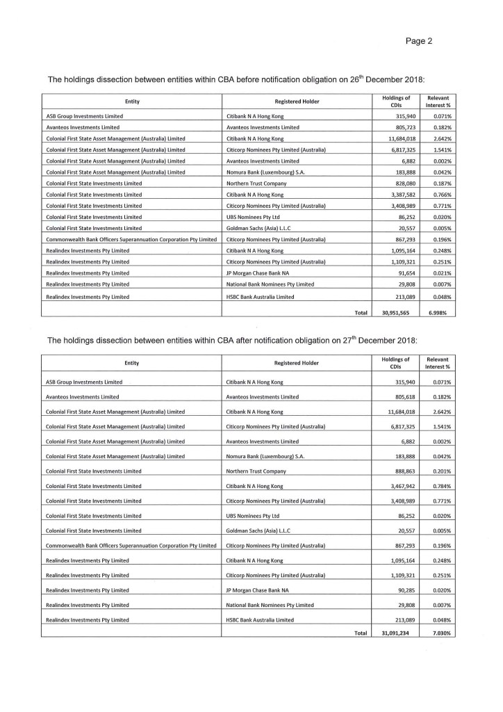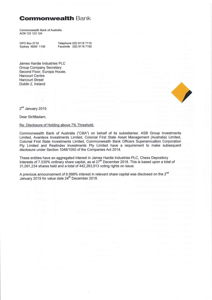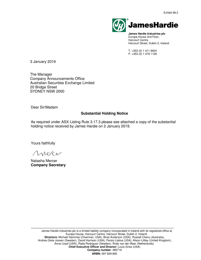 Exhibit 99.2 James Hardie Industries plc Europa House 2nd Floor, Harcourt Centre Harcourt Street, Dublin 2, Ireland T: +353 (0) 1 411 6924 F: +353 (0) 1 479 1128 3 January 2019 The Manager Company Announcements Office Australian Securities Exchange Limited 20 Bridge Street SYDNEY NSW 2000 Dear Sir/Madam Substantial Holding Notice As required under ASX Listing Rule 3.17.3 please see attached a copy of the substantial holding notice received by James Hardie on 2 January 2019. Yours faithfully Natasha Mercer Company Secretary James Hardie Industries plc is a limited liability company incorporated in Ireland with its registered office at Europa House, Harcourt Centre, Harcourt Street, Dublin 2, Ireland. Directors: Michael Hammes (Chairman, USA), Brian Anderson (USA), Russell Chenu (Australia), Andrea Gisle Joosen (Sweden), David Harrison (USA), Persio Lisboa (USA), Alison Littley (United Kingdom), Anne Lloyd (USA), Rada Rodriguez (Sweden), Rudy van der Meer (Netherlands). Chief Executive Officer and Director: Louis Gries (USA) Company number: 485719 ARBN: 097 829 895
