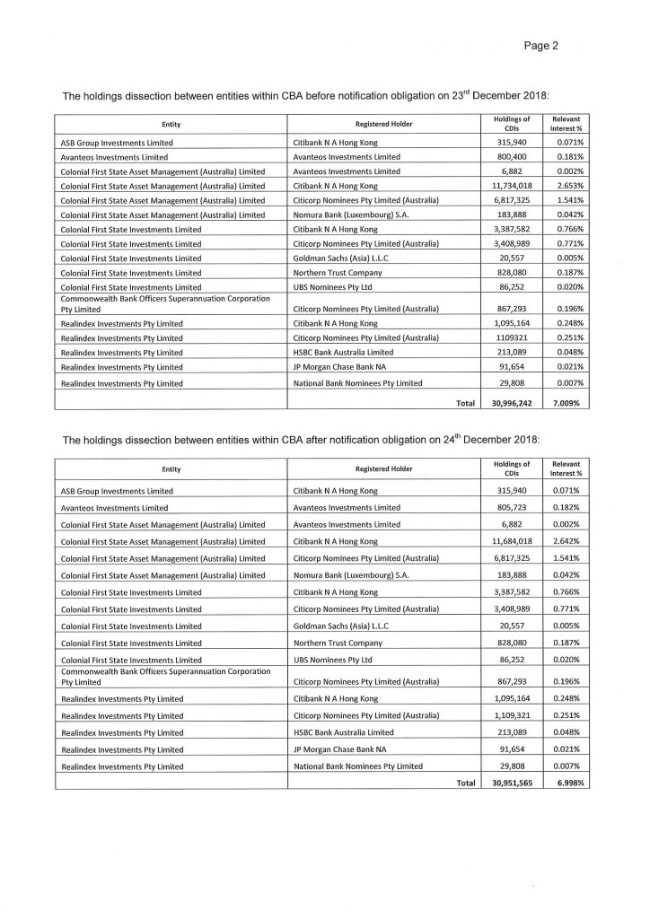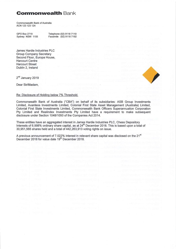 Exhibit 99.1 James Hardie Industries plc Europa House 2nd Floor, Harcourt Centre Harcourt Street, Dublin 2, Ireland T: +353 (0) 1 411 6924 F: +353 (0) 1 479 1128 3 January 2019 The Manager Company Announcements Office Australian Securities Exchange Limited 20 Bridge Street SYDNEY NSW 2000 Dear Sir/Madam Substantial Holding Notice As required under ASX Listing Rule 3.17.3 please see attached a copy of the substantial holding notice received by James Hardie on 2 January 2019. Yours faithfully Natasha Mercer Company Secretary James Hardie Industries plc is a limited liability company incorporated in Ireland with its registered office at Europa House, Harcourt Centre, Harcourt Street, Dublin 2, Ireland. Directors: Michael Hammes (Chairman, USA), Brian Anderson (USA), Russell Chenu (Australia), Andrea Gisle Joosen (Sweden), David Harrison (USA), Persio Lisboa (USA), Alison Littley (United Kingdom), Anne Lloyd (USA), Rada Rodriguez (Sweden), Rudy van der Meer (Netherlands). Chief Executive Officer and Director: Louis Gries (USA) Company number: 485719 ARBN: 097 829 895