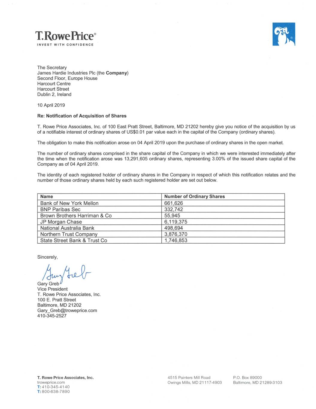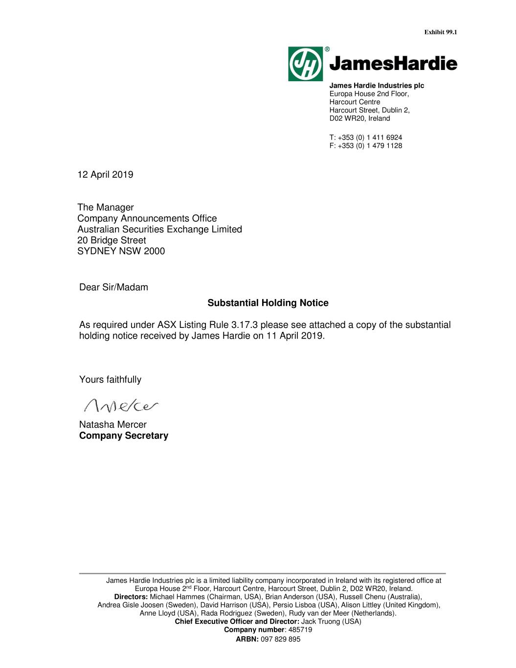 Exhibit 99.1 James Hardie Industries plc Europa House 2nd Floor, Harcourt Centre Harcourt Street, Dublin 2, D02 WR20, Ireland T: +353 (0) 1 411 6924 F: +353 (0) 1 479 1128 12 April 2019 The Manager Company Announcements Office Australian Securities Exchange Limited 20 Bridge Street SYDNEY NSW 2000 Dear Sir/Madam Substantial Holding Notice As required under ASX Listing Rule 3.17.3 please see attached a copy of the substantial holding notice received by James Hardie on 11 April 2019. Yours faithfully Natasha Mercer Company Secretary James Hardie Industries plc is a limited liability company incorporated in Ireland with its registered office at Europa House 2nd Floor, Harcourt Centre, Harcourt Street, Dublin 2, D02 WR20, Ireland. Directors: Michael Hammes (Chairman, USA), Brian Anderson (USA), Russell Chenu (Australia), Andrea Gisle Joosen (Sweden), David Harrison (USA), Persio Lisboa (USA), Alison Littley (United Kingdom), Anne Lloyd (USA), Rada Rodriguez (Sweden), Rudy van der Meer (Netherlands). Chief Executive Officer and Director: Jack Truong (USA) Company number : 485719 ARBN: 097 829 895