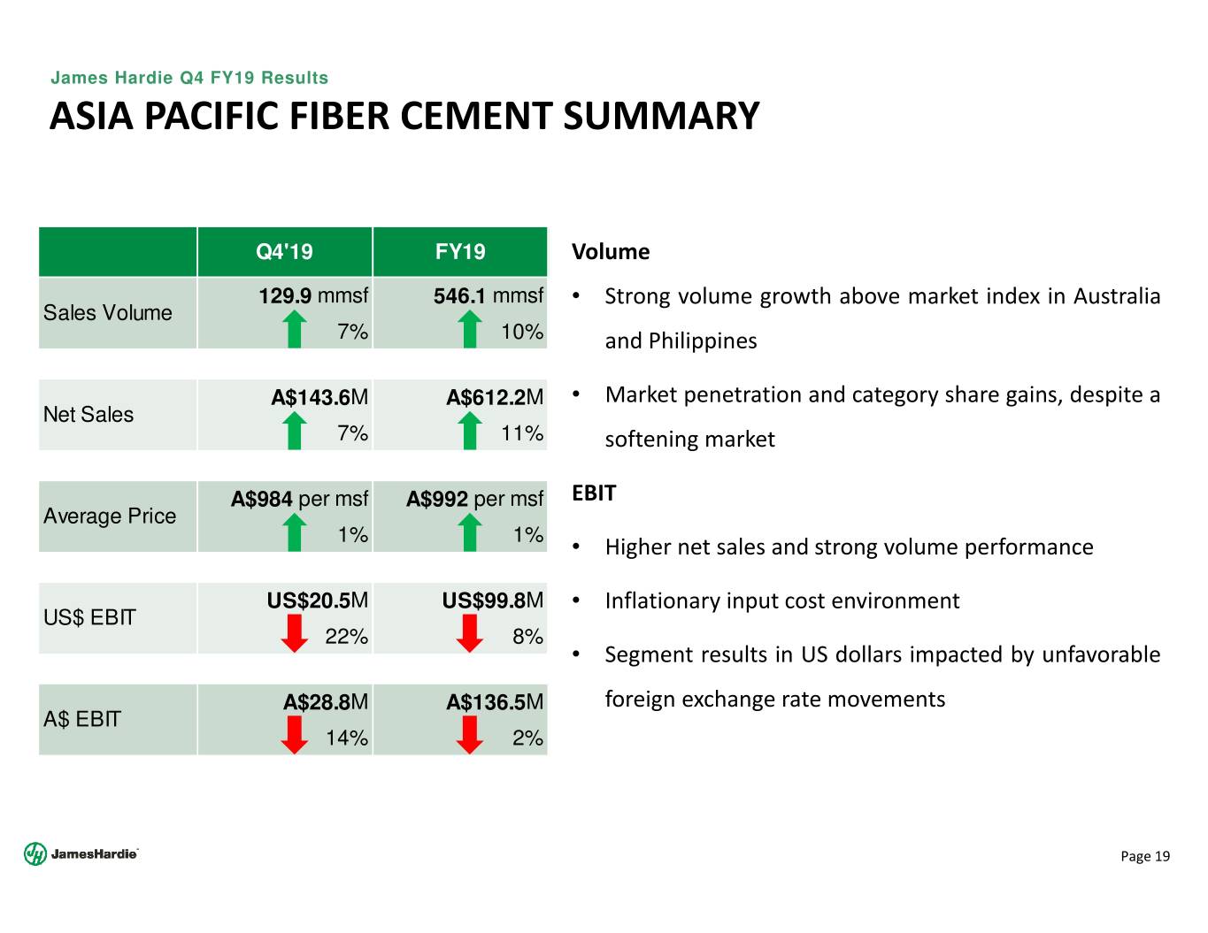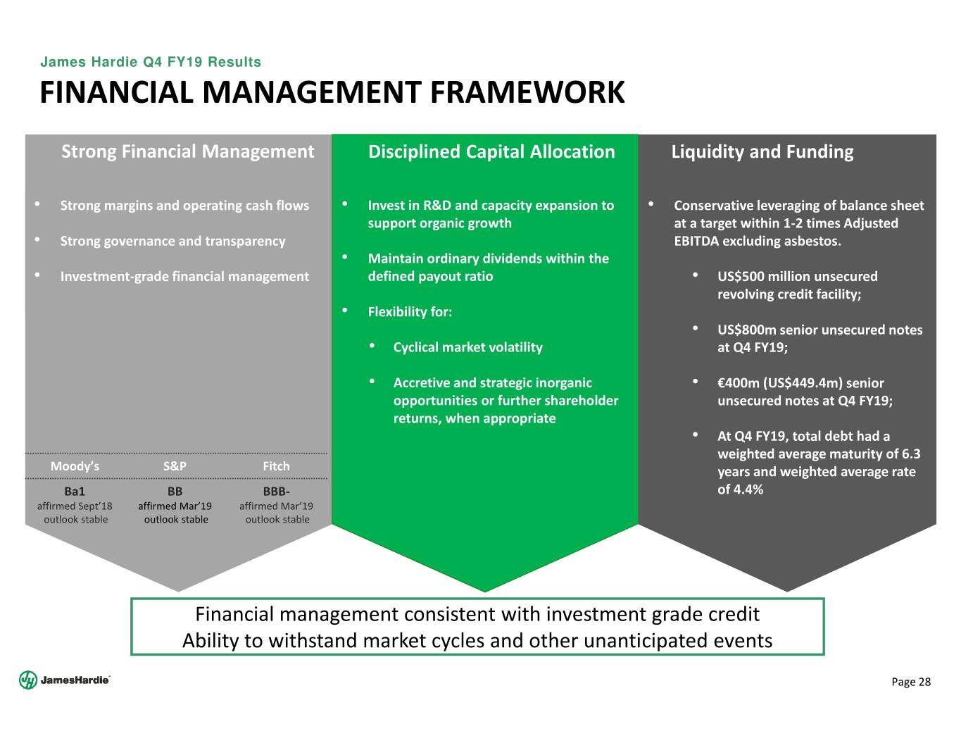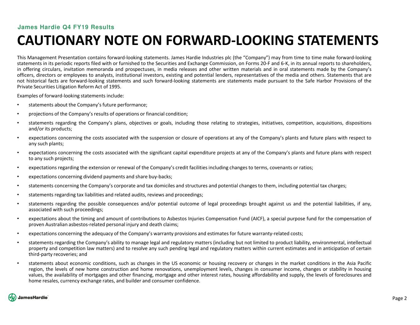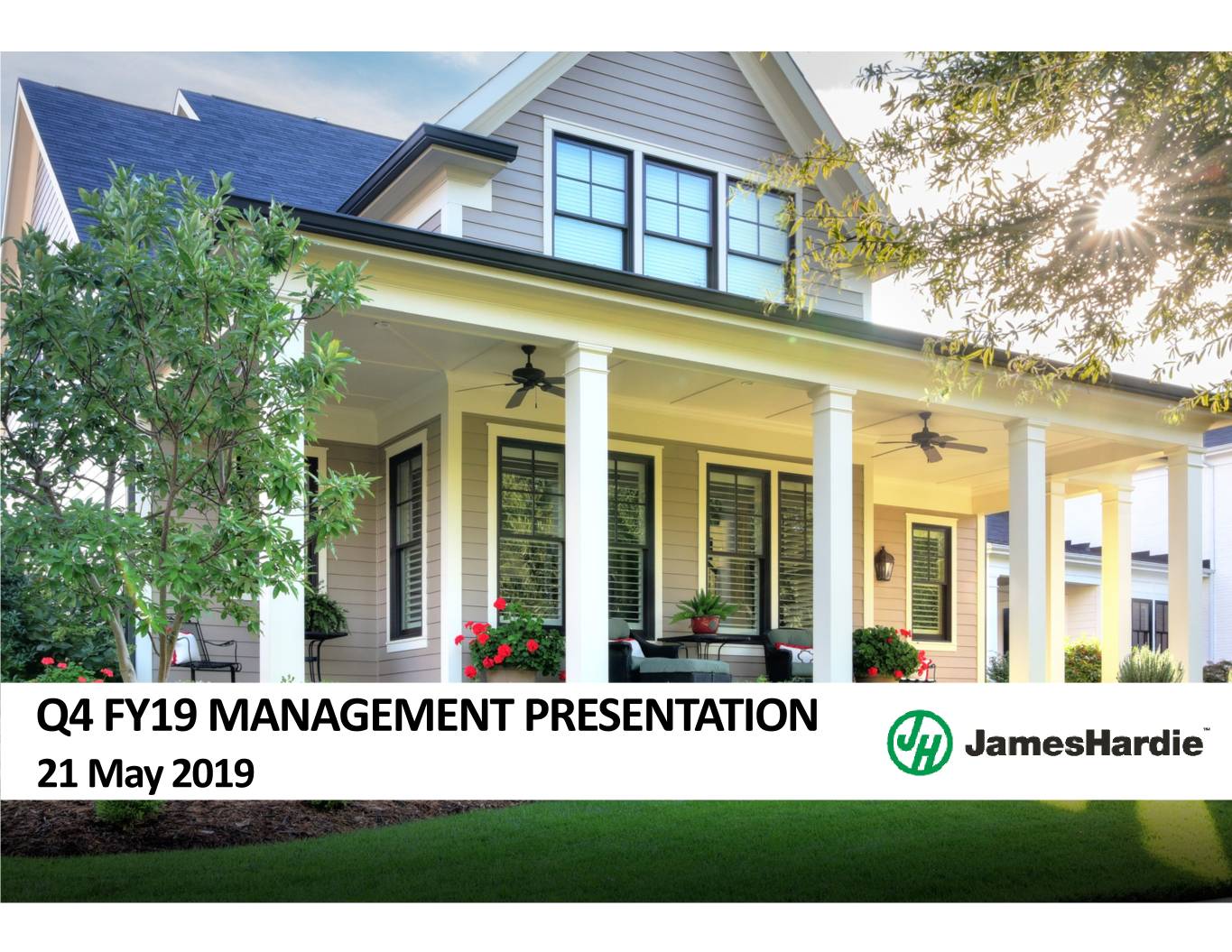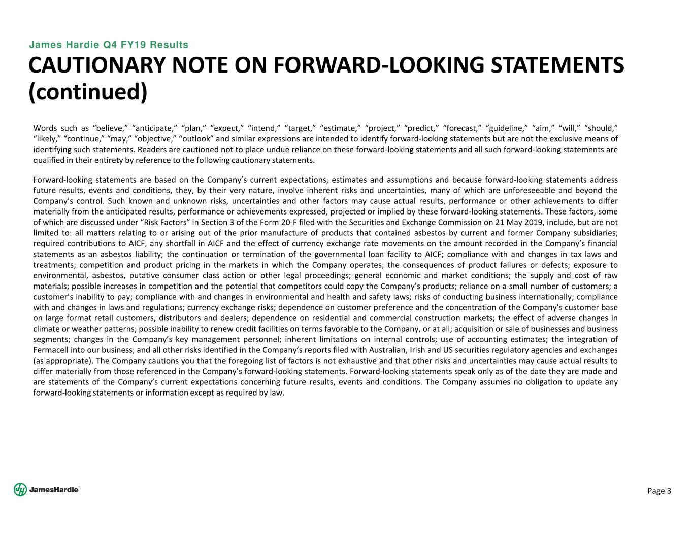 James Hardie Q4 FY19 Results CAUTIONARY NOTE ON FORWARD-LOOKING STATEMENTS This Management Presentation contains forward-looking statements. James Hardie Industries plc (the “Company”) may from time to time make forward-looking statements in its periodic reports filed with or furnished to the Securities and Exchange Commission, on Forms 20-F and 6-K, in its annual reports to shareholders, in offering circulars, invitation memoranda and prospectuses, in media releases and other written materials and in oral statements made by the Company’s officers, directors or employees to analysts, institutional investors, existing and potential lenders, representatives of the media and others. Statements that are not historical facts are forward-looking statements and such forward-looking statements are statements made pursuant to the Safe Harbor Provisions of the Private Securities Litigation Reform Act of 1995. Examples of forward-looking statements include: • statements about the Company’s future performance; • projections of the Company’s results of operations or financial condition; • statements regarding the Company’s plans, objectives or goals, including those relating to strategies, initiatives, competition, acquisitions, dispositions and/or its products; • expectations concerning the costs associated with the suspension or closure of operations at any of the Company’s plants and future plans with respect to any such plants; • expectations concerning the costs associated with the significant capital expenditure projects at any of the Company’s plants and future plans with respect to any such projects; • expectations regarding the extension or renewal of the Company’s credit facilities including changes to terms, covenants or ratios; • expectations concerning dividend payments and share buy-backs; • statements concerning the Company’s corporate and tax domiciles and structures and potential changes to them, including potential tax charges; • statements regarding tax liabilities and related audits, reviews and proceedings; • statements regarding the possible consequences and/or potential outcome of legal proceedings brought against us and the potential liabilities, if any, associated with such proceedings; • expectations about the timing and amount of contributions to Asbestos Injuries Compensation Fund (AICF), a special purpose fund for the compensation of proven Australian asbestos-related personal injury and death claims; • expectations concerning the adequacy of the Company’s warranty provisions and estimates for future warranty-related costs; • statements regarding the Company’s ability to manage legal and regulatory matters (including but not limited to product liability, environmental, intellectual property and competition law matters) and to resolve any such pending legal and regulatory matters within current estimates and in anticipation of certain third-party recoveries; and • statements about economic conditions, such as changes in the US economic or housing recovery or changes in the market conditions in the Asia Pacific region, the levels of new home construction and home renovations, unemployment levels, changes in consumer income, changes or stability in housing values, the availability of mortgages and other financing, mortgage and other interest rates, housing affordability and supply, the levels of foreclosures and home resales, currency exchange rates, and builder and consumer confidence. Page 2