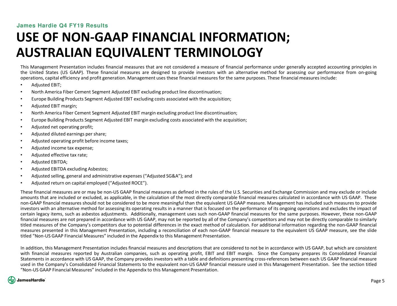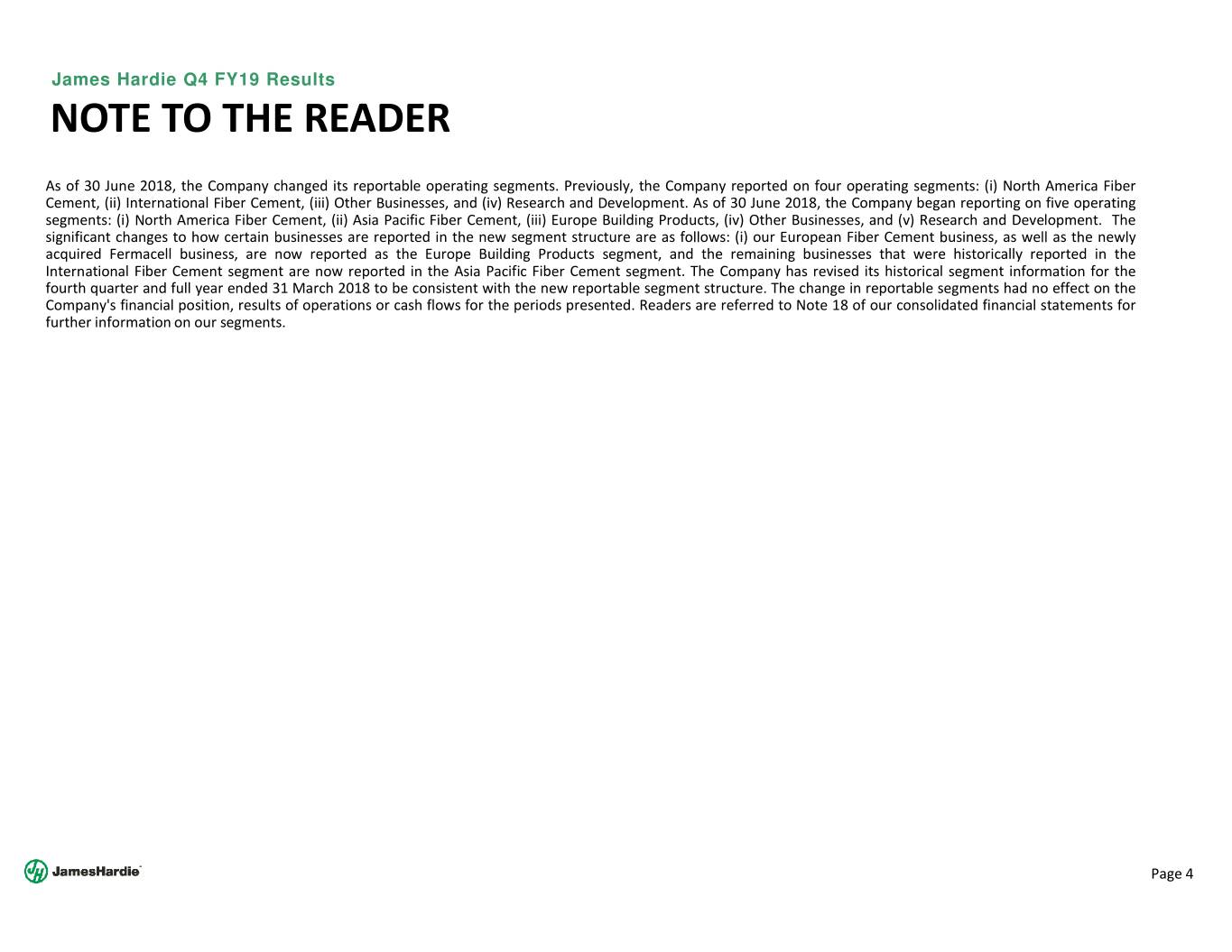 James Hardie Q4 FY19 Results NOTE TO THE READER As of 30 June 2018, the Company changed its reportable operating segments. Previously, the Company reported on four operating segments: (i) North America Fiber Cement, (ii) International Fiber Cement, (iii) Other Businesses, and (iv) Research and Development. As of 30 June 2018, the Company began reporting on five operating segments: (i) North America Fiber Cement, (ii) Asia Pacific Fiber Cement, (iii) Europe Building Products, (iv) Other Businesses, and (v) Research and Development. The significant changes to how certain businesses are reported in the new segment structure are as follows: (i) our European Fiber Cement business, as well as the newly acquired Fermacell business, are now reported as the Europe Building Products segment, and the remaining businesses that were historically reported in the International Fiber Cement segment are now reported in the Asia Pacific Fiber Cement segment. The Company has revised its historical segment information for the fourth quarter and full year ended 31 March 2018 to be consistent with the new reportable segment structure. The change in reportable segments had no effect on the Company's financial position, results of operations or cash flows for the periods presented. Readers are referred to Note 18 of our consolidated financial statements for further information on our segments. Page 4