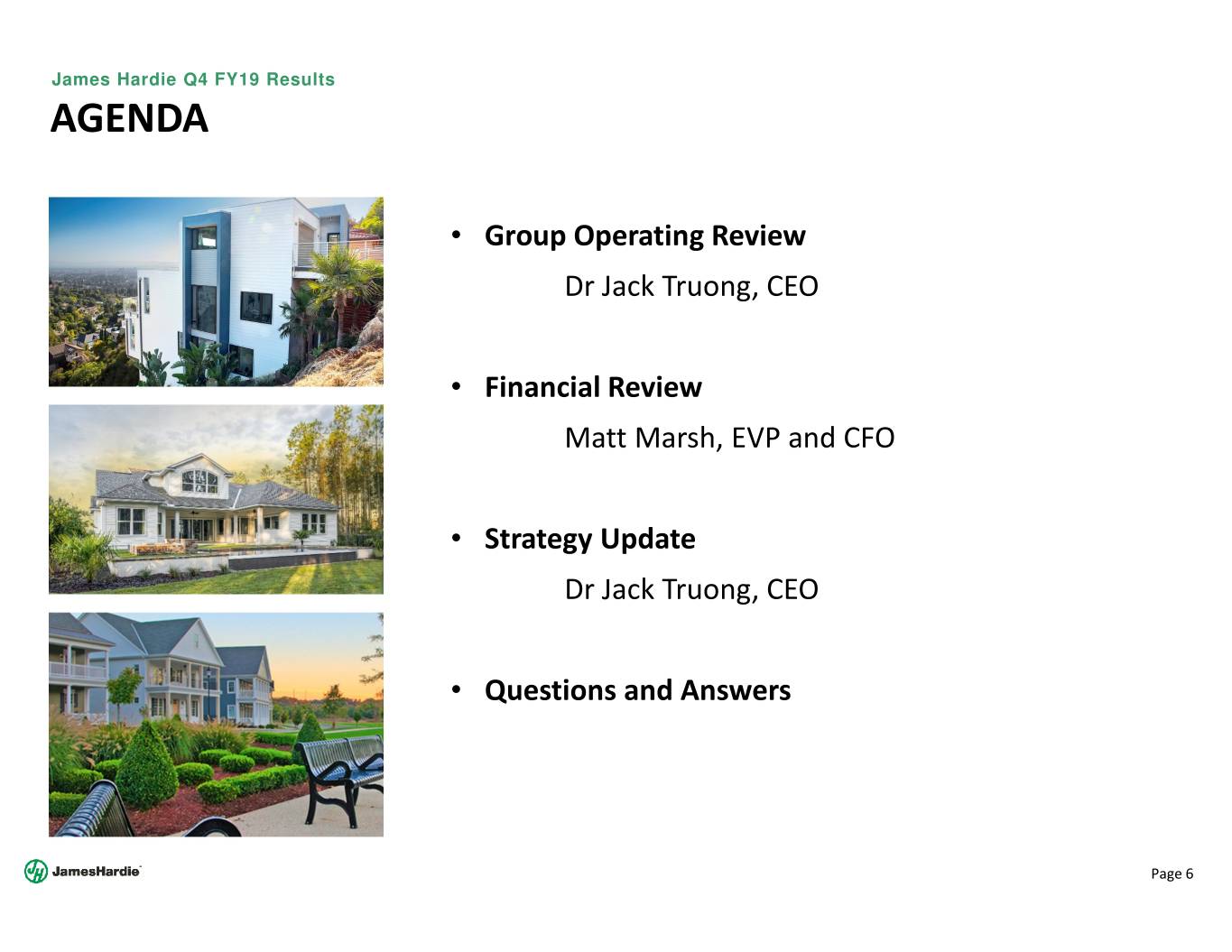 James Hardie Q4 FY19 Results AGENDA • Group Operating Review Dr Jack Truong, CEO • Financial Review Matt Marsh, EVP and CFO • Strategy Update Dr Jack Truong, CEO • Questions and Answers Page 6