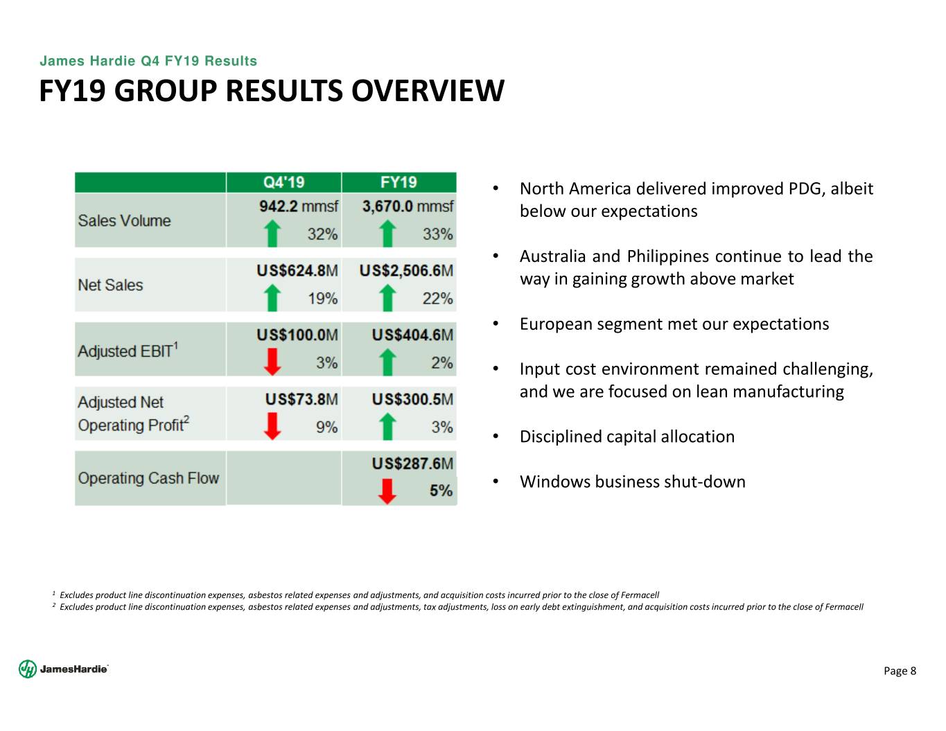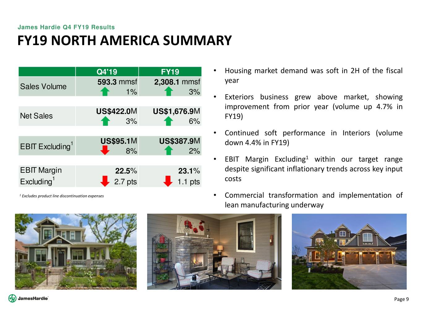 James Hardie Q4 FY19 Results FY19 GROUP RESULTS OVERVIEW • North America delivered improved PDG, albeit below our expectations • Australia and Philippines continue to lead the way in gaining growth above market • European segment met our expectations • Input cost environment remained challenging, and we are focused on lean manufacturing • Disciplined capital allocation • Windows business shut-down 1 Excludes product line discontinuation expenses, asbestos related expenses and adjustments, and acquisition costs incurred prior to the close of Fermacell 2 Excludes product line discontinuation expenses, asbestos related expenses and adjustments, tax adjustments, loss on early debt extinguishment, and acquisition costs incurred prior to the close of Fermacell Page 8