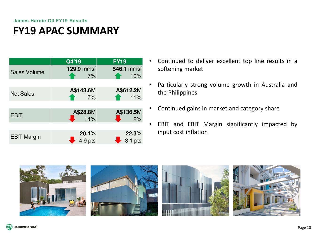 James Hardie Q4 FY19 Results FY19 APAC SUMMARY Q4'19 FY19 • Continued to deliver excellent top line results in a 129.9 mmsf 546.1 mmsf softening market Sales Volume 7% 10% • Particularly strong volume growth in Australia and A$143.6 M A$612.2 M Net Sales the Philippines 7% 11% • Continued gains in market and category share A$28.8 M A$136.5 M EBIT 14% 2% • EBIT and EBIT Margin significantly impacted by 20.1 % 22.3 % input cost inflation EBIT Margin 4.9 pts 3.1 pts Page 10
