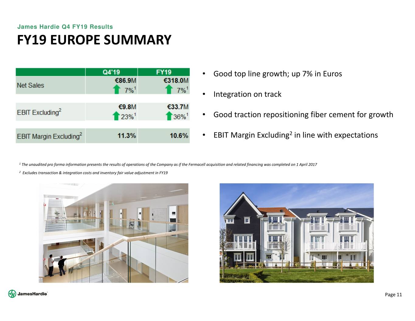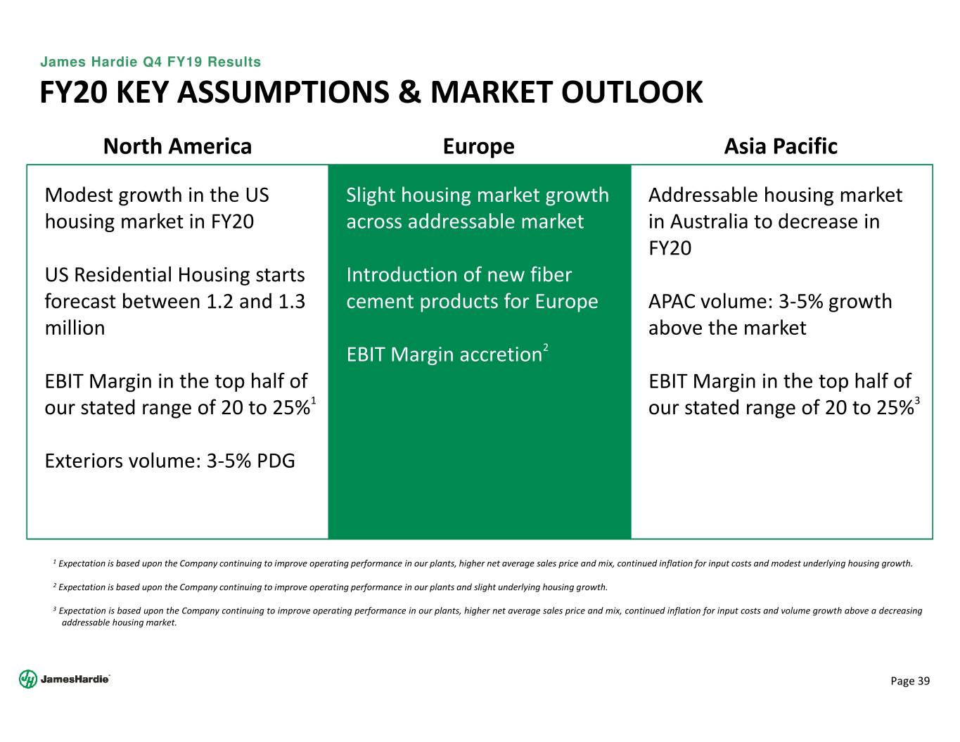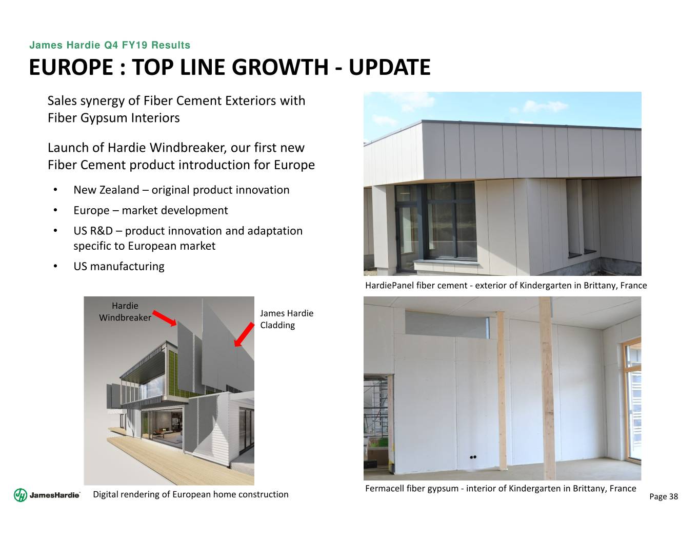James Hardie Q4 FY19 Results EUROPE : TOP LINE GROWTH - UPDATE Sales synergy of Fiber Cement Exteriors with Fiber Gypsum Interiors Launch of Hardie Windbreaker, our first new Fiber Cement product introduction for Europe • New Zealand – original product innovation • Europe – market development • US R&D – product innovation and adaptation specific to European market • US manufacturing HardiePanel fiber cement - exterior of Kindergarten in Brittany, France Hardie Windbreaker James Hardie Cladding Fermacell fiber gypsum - interior of Kindergarten in Brittany, France Digital rendering of European home construction Page 38