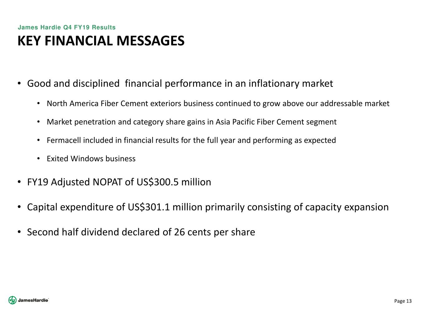 James Hardie Q4 FY19 Results CAUTIONARY NOTE ON FORWARD-LOOKING STATEMENTS (continued) Words such as “believe,” “anticipate,” “plan,” “expect,” “intend,” “target,” “estimate,” “project,” “predict,” “forecast,” “guideline,” “aim,” “will,” “should,” “likely,” “continue,” “may,” “objective,” “outlook” and similar expressions are intended to identify forward-looking statements but are not the exclusive means of identifying such statements. Readers are cautioned not to place undue reliance on these forward-looking statements and all such forward-looking statements are qualified in their entirety by reference to the following cautionary statements. Forward-looking statements are based on the Company’s current expectations, estimates and assumptions and because forward-looking statements address future results, events and conditions, they, by their very nature, involve inherent risks and uncertainties, many of which are unforeseeable and beyond the Company’s control. Such known and unknown risks, uncertainties and other factors may cause actual results, performance or other achievements to differ materially from the anticipated results, performance or achievements expressed, projected or implied by these forward-looking statements. These factors, some of which are discussed under “Risk Factors” in Section 3 of the Form 20-F filed with the Securities and Exchange Commission on 21 May 2019, include, but are not limited to: all matters relating to or arising out of the prior manufacture of products that contained asbestos by current and former Company subsidiaries; required contributions to AICF, any shortfall in AICF and the effect of currency exchange rate movements on the amount recorded in the Company’s financial statements as an asbestos liability; the continuation or termination of the governmental loan facility to AICF; compliance with and changes in tax laws and treatments; competition and product pricing in the markets in which the Company operates; the consequences of product failures or defects; exposure to environmental, asbestos, putative consumer class action or other legal proceedings; general economic and market conditions; the supply and cost of raw materials; possible increases in competition and the potential that competitors could copy the Company’s products; reliance on a small number of customers; a customer’s inability to pay; compliance with and changes in environmental and health and safety laws; risks of conducting business internationally; compliance with and changes in laws and regulations; currency exchange risks; dependence on customer preference and the concentration of the Company’s customer base on large format retail customers, distributors and dealers; dependence on residential and commercial construction markets; the effect of adverse changes in climate or weather patterns; possible inability to renew credit facilities on terms favorable to the Company, or at all; acquisition or sale of businesses and business segments; changes in the Company’s key management personnel; inherent limitations on internal controls; use of accounting estimates; the integration of Fermacell into our business; and all other risks identified in the Company’s reports filed with Australian, Irish and US securities regulatory agencies and exchanges (as appropriate). The Company cautions you that the foregoing list of factors is not exhaustive and that other risks and uncertainties may cause actual results to differ materially from those referenced in the Company’s forward-looking statements. Forward-looking statements speak only as of the date they are made and are statements of the Company’s current expectations concerning future results, events and conditions. The Company assumes no obligation to update any forward-looking statements or information except as required by law. Page 3