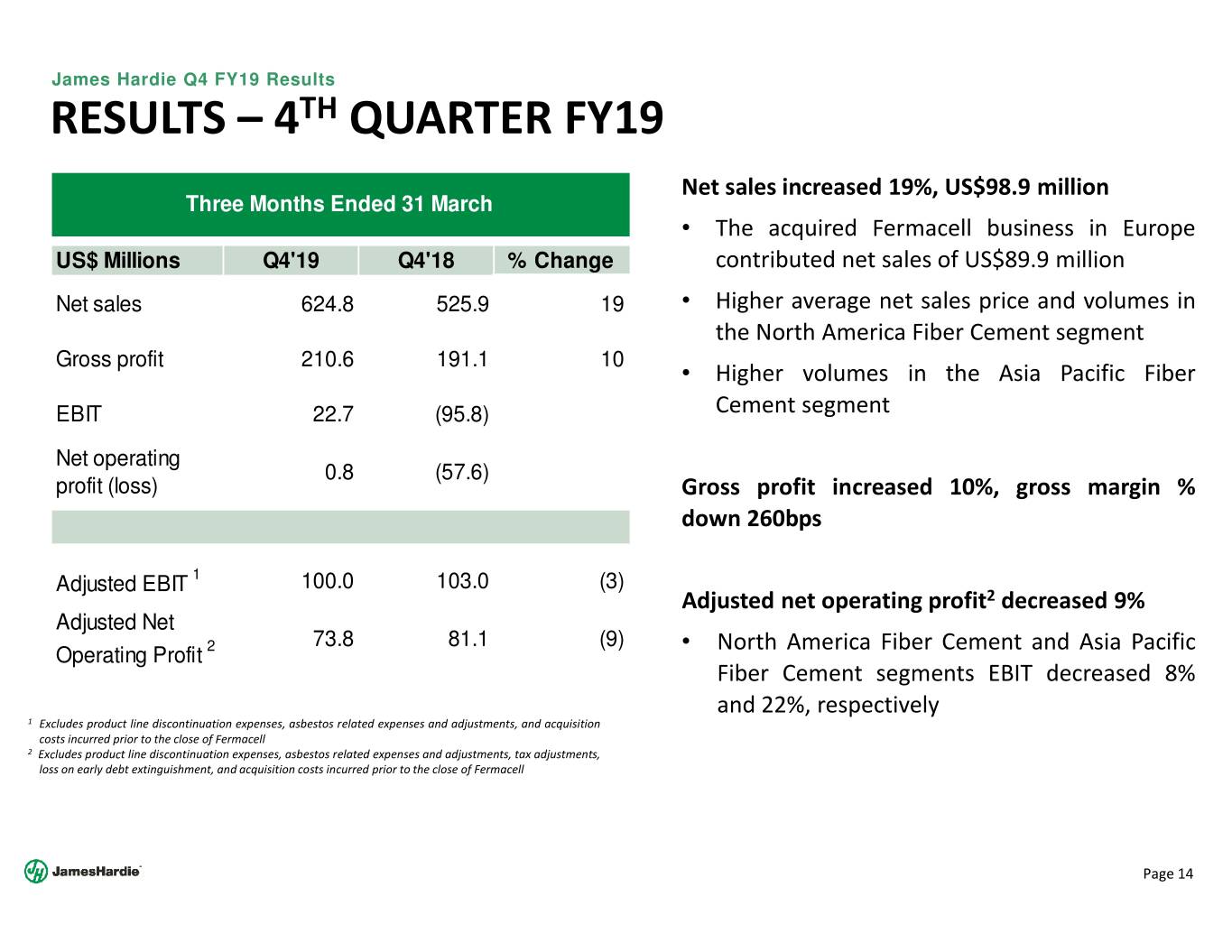 James Hardie Q4 FY19 Results KEY FINANCIAL MESSAGES • Good and disciplined financial performance in an inflationary market • North America Fiber Cement exteriors business continued to grow above our addressable market • Market penetration and category share gains in Asia Pacific Fiber Cement segment • Fermacell included in financial results for the full year and performing as expected • Exited Windows business • FY19 Adjusted NOPAT of US$300.5 million • Capital expenditure of US$301.1 million primarily consisting of capacity expansion • Second half dividend declared of 26 cents per share Page 13
