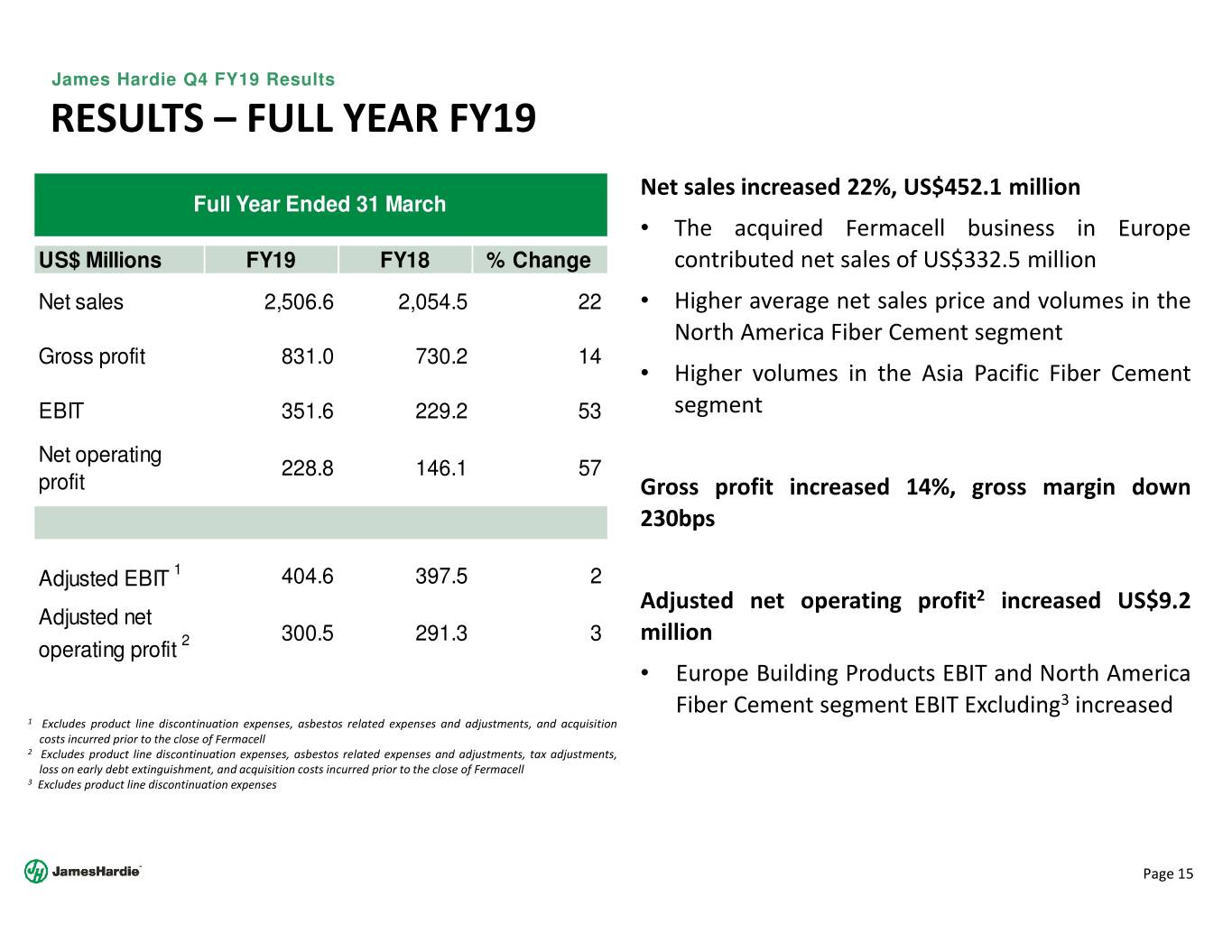 James Hardie Q4 FY19 Results RESULTS – 4TH QUARTER FY19 Net sales increased 19%, US$98.9 million Three Months Ended 31 March • The acquired Fermacell business in Europe US$ Millions Q4'19 Q4'18 % Change contributed net sales of US$89.9 million Net sales 624.8 525.9 19 • Higher average net sales price and volumes in the North America Fiber Cement segment Gross profit 210.6 191.1 10 • Higher volumes in the Asia Pacific Fiber EBIT 22.7 (95.8) Cement segment Net operating 0.8 (57.6) profit (loss) Gross profit increased 10%, gross margin % down 260bps Adjusted EBIT 1 100.0 103.0 (3) Adjusted net operating profit 2 decreased 9% Adjusted Net 73.8 81.1 (9) Operating Profit 2 • North America Fiber Cement and Asia Pacific Fiber Cement segments EBIT decreased 8% and 22%, respectively 1 Excludes product line discontinuation expenses, asbestos related expenses and adjustments, and acquisition costs incurred prior to the close of Fermacell 2 Excludes product line discontinuation expenses, asbestos related expenses and adjustments, tax adjustments, loss on early debt extinguishment, and acquisition costs incurred prior to the close of Fermacell Page 14