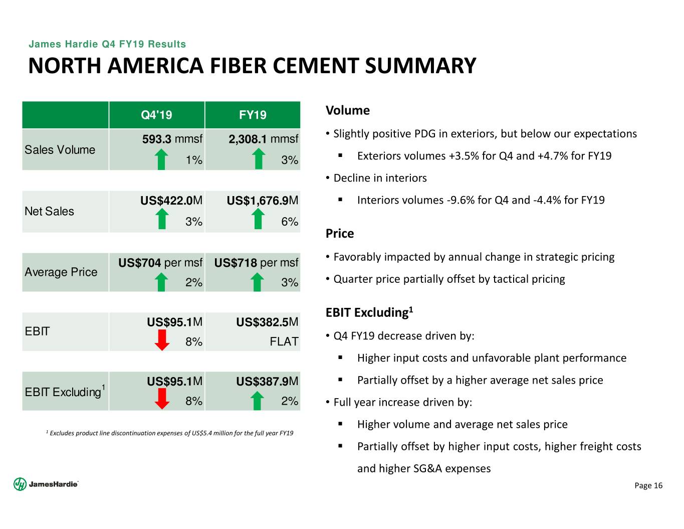 James Hardie Q4 FY19 Results RESULTS – FULL YEAR FY19 Net sales increased 22%, US$452.1 million Full Year Ended 31 March • The acquired Fermacell business in Europe US$ Millions FY19 FY18 % Change contributed net sales of US$332.5 million Net sales 2,506.6 2,054.5 22 • Higher average net sales price and volumes in the North America Fiber Cement segment Gross profit 831.0 730.2 14 • Higher volumes in the Asia Pacific Fiber Cement EBIT 351.6 229.2 53 segment Net operating 228.8 146.1 57 profit Gross profit increased 14%, gross margin down 230bps Adjusted EBIT 1 404.6 397.5 2 Adjusted net operating profit 2 increased US$9.2 Adjusted net 300.5 291.3 3 million operating profit2 • Europe Building Products EBIT and North America Fiber Cement segment EBIT Excluding 3 increased 1 Excludes product line discontinuation expenses, asbestos related expenses and adjustments, and acquisition costs incurred prior to the close of Fermacell 2 Excludes product line discontinuation expenses, asbestos related expenses and adjustments, tax adjustments, loss on early debt extinguishment, and acquisition costs incurred prior to the close of Fermacell 3 Excludes product line discontinuation expenses Page 15