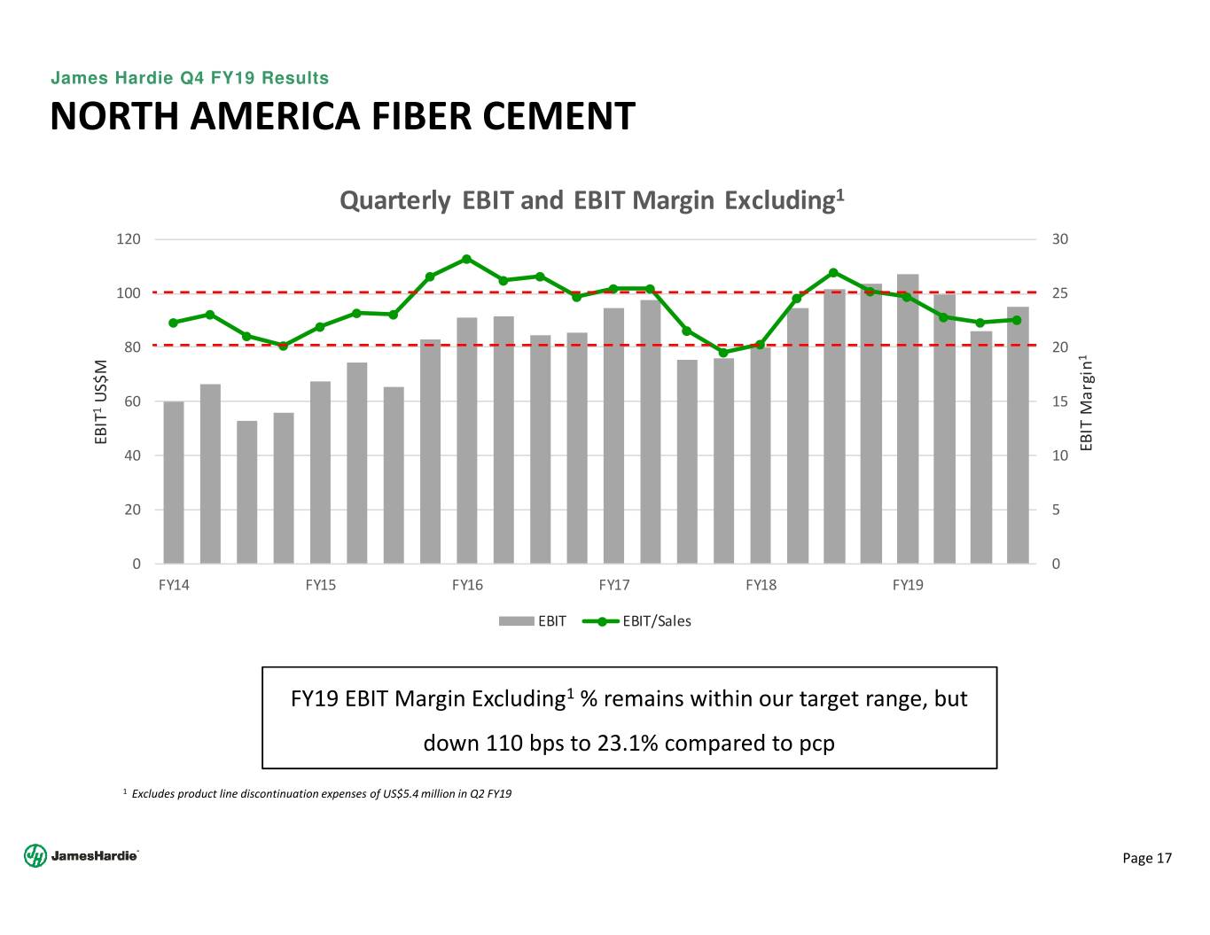 James Hardie Q4 FY19 Results NORTH AMERICA FIBER CEMENT SUMMARY Q4'19 FY19 Volume Slightly positive PDG in exteriors, but below our expectations 593.3 mmsf 2,308.1 mmsf • Sales Volume 1% 3% Exteriors volumes +3.5% for Q4 and +4.7% for FY19 • Decline in interiors US$422.0 M US$1,676.9 M Interiors volumes -9.6% for Q4 and -4.4% for FY19 Net Sales 3% 6% Price • Favorably impacted by annual change in strategic pricing US$704 per msf US$718 per msf Average Price 2% 3% • Quarter price partially offset by tactical pricing EBIT Excluding 1 US$95.1 M US$382.5 M EBIT • Q4 FY19 decrease driven by: 8% FLAT Higher input costs and unfavorable plant performance US$95.1 M US$387.9 M Partially offset by a higher average net sales price EBIT Excluding 1 8% 2% • Full year increase driven by: Higher volume and average net sales price 1 Excludes product line discontinuation expenses of US$5.4 million for the full year FY19 Partially offset by higher input costs, higher freight costs and higher SG&A expenses Page 16