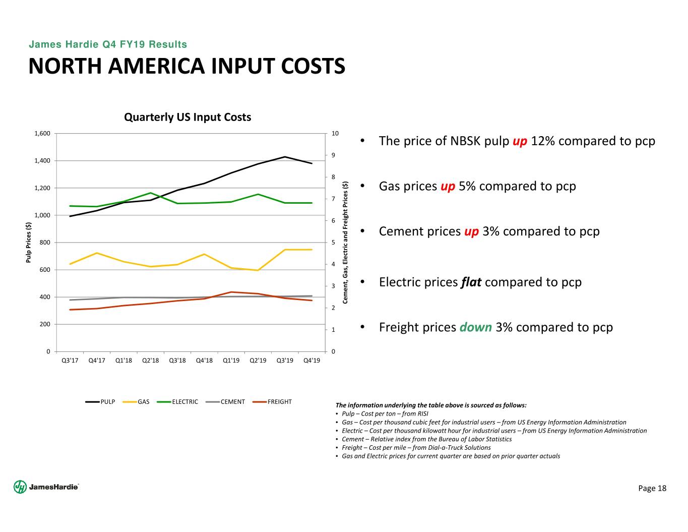 James Hardie Q4 FY19 Results NORTH AMERICA INPUT COSTS Quarterly US Input Costs 1,600 10 • The price of NBSK pulp up 12% compared to pcp 9 1,400 8 1,200 • Gas prices up 5% compared to pcp 7 1,000 6 • Cement prices up 3% compared to pcp 800 5 Pulp Prices ($) 4 600 3 • Electric prices flat compared to pcp 400 Cement, ElectricGas, and Freight Prices ($) 2 200 1 • Freight prices down 3% compared to pcp 0 0 Q3'17 Q4'17 Q1'18 Q2'18 Q3'18 Q4'18 Q1'19 Q2'19 Q3'19 Q4'19 PULP GAS ELECTRIC CEMENT FREIGHT The information underlying the table above is sourced as follows: • Pulp – Cost per ton – from RISI • Gas – Cost per thousand cubic feet for industrial users – from US Energy Information Administration • Electric – Cost per thousand kilowatt hour for industrial users – from US Energy Information Administration • Cement – Relative index from the Bureau of Labor Statistics • Freight – Cost per mile – from Dial-a-Truck Solutions • Gas and Electric prices for current quarter are based on prior quarter actuals Page 18